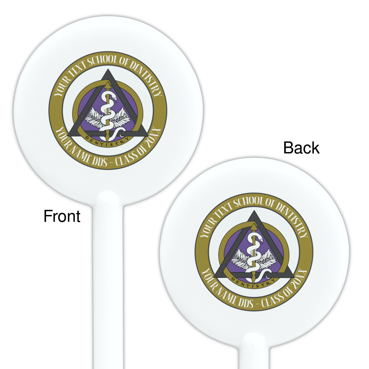 This design features the dental insignia (aka emblem, symbol, logo) at the center with personalization in a circle around the emblem.You can customize the name of the dental school, as well as the name of the dentist and the year they graduated.