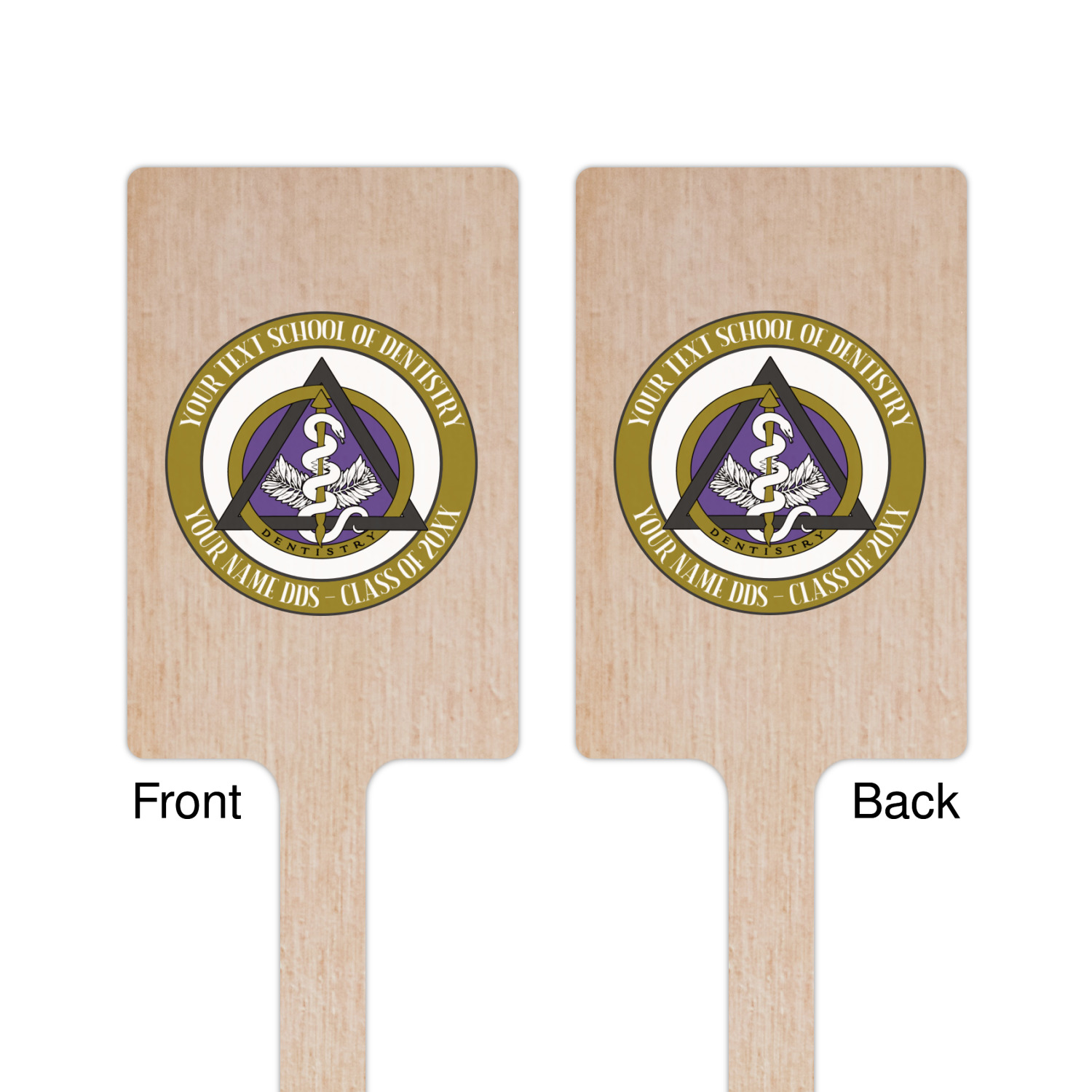 This design features the dental insignia (aka emblem, symbol, logo) at the center with personalization in a circle around the emblem.You can customize the name of the dental school, as well as the name of the dentist and the year they graduated.