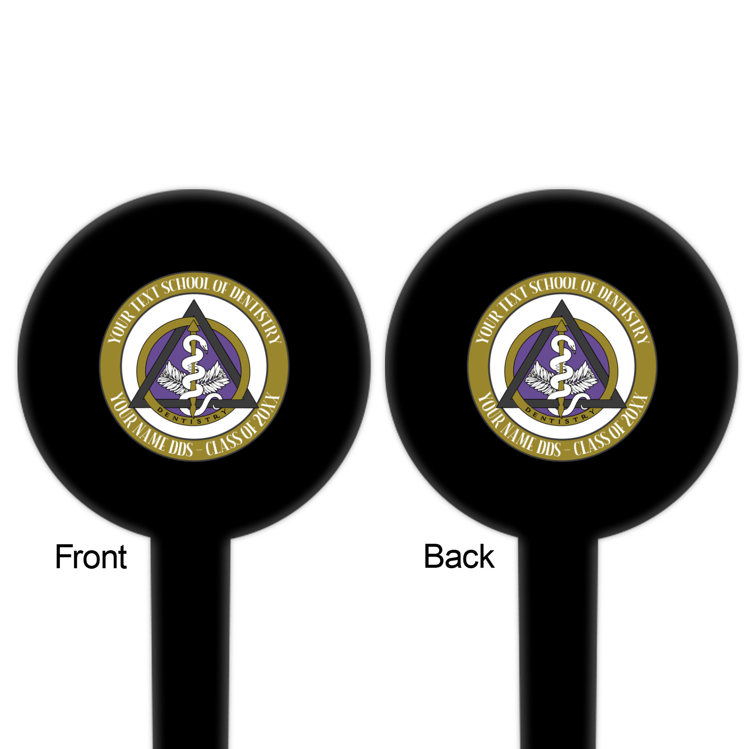 This design features the dental insignia (aka emblem, symbol, logo) at the center with personalization in a circle around the emblem.You can customize the name of the dental school, as well as the name of the dentist and the year they graduated.