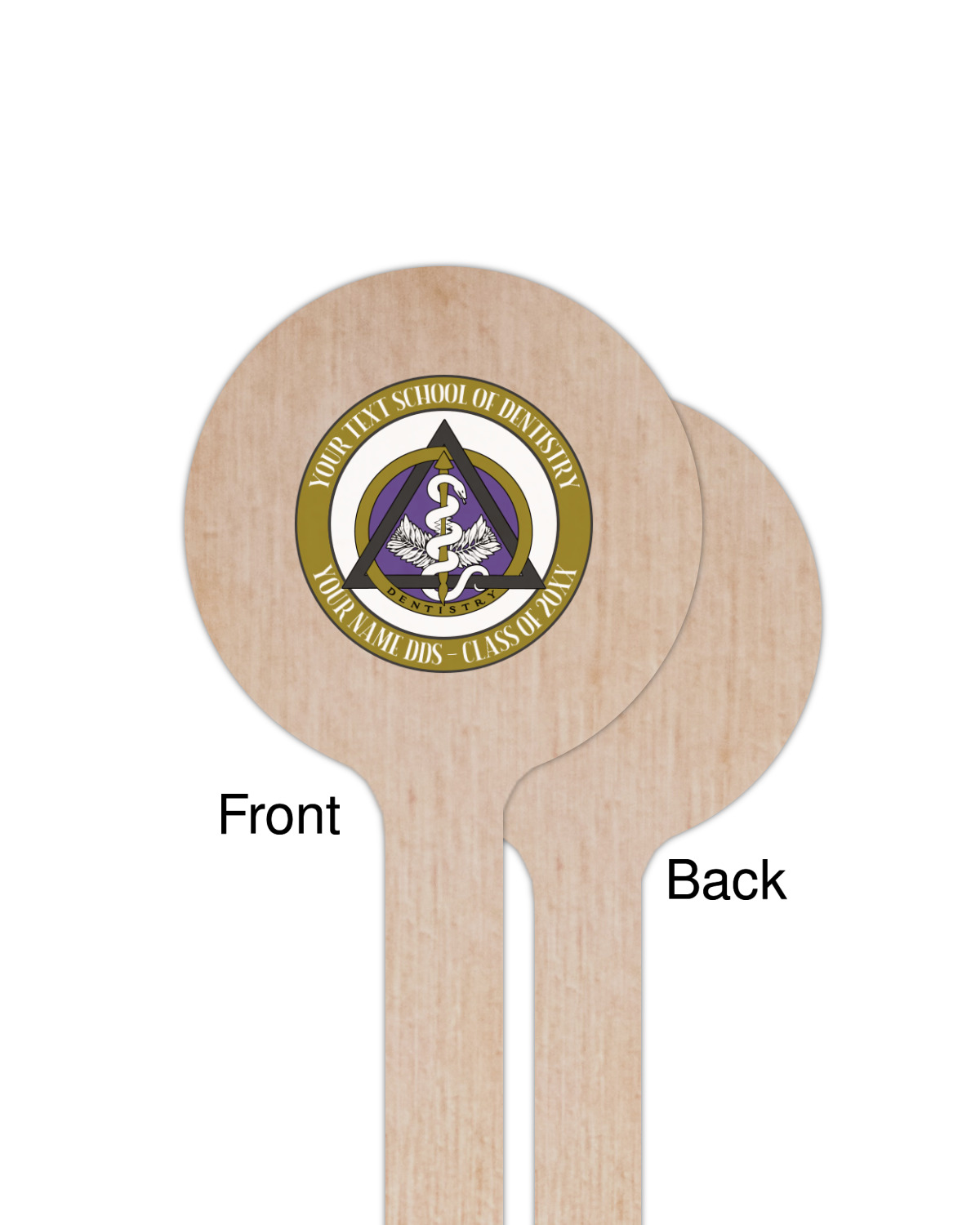 This design features the dental insignia (aka emblem, symbol, logo) at the center with personalization in a circle around the emblem.You can customize the name of the dental school, as well as the name of the dentist and the year they graduated.