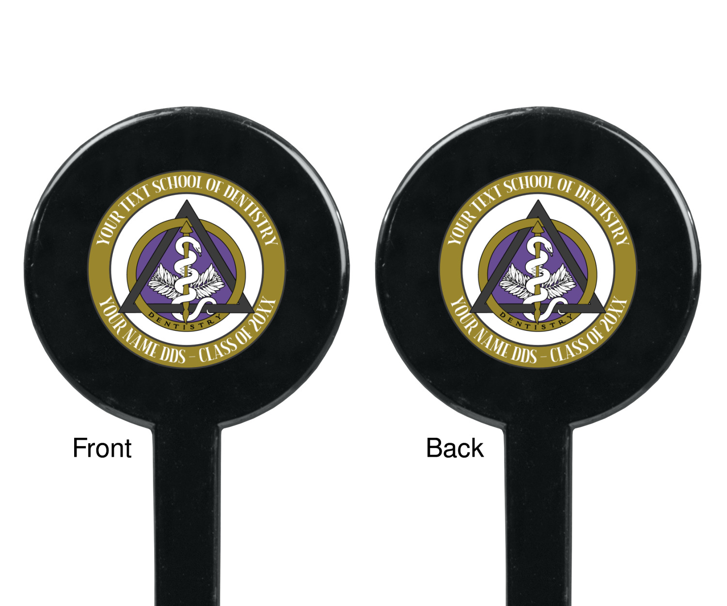 This design features the dental insignia (aka emblem, symbol, logo) at the center with personalization in a circle around the emblem.You can customize the name of the dental school, as well as the name of the dentist and the year they graduated.