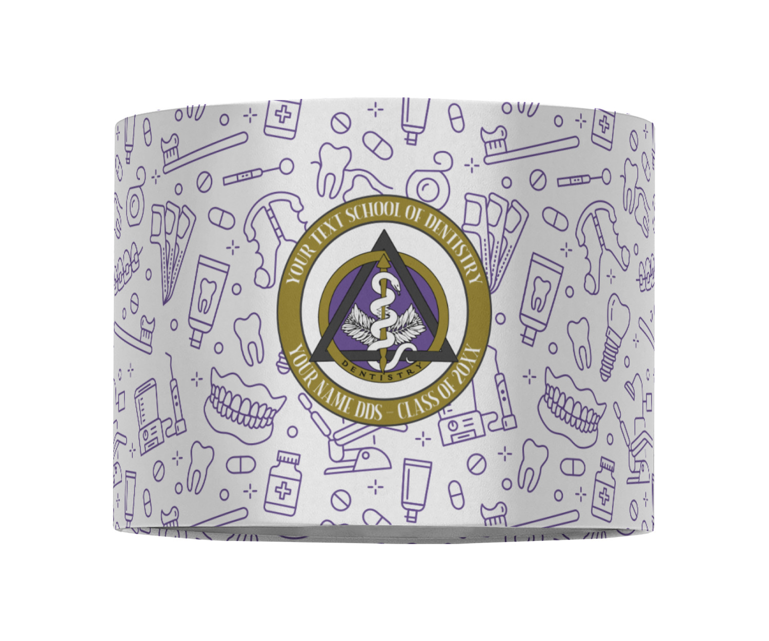 This design features the dental insignia (aka emblem, symbol, logo) at the center with personalization in a circle around the emblem.You can customize the name of the dental school, as well as the name of the dentist and the year they graduated.