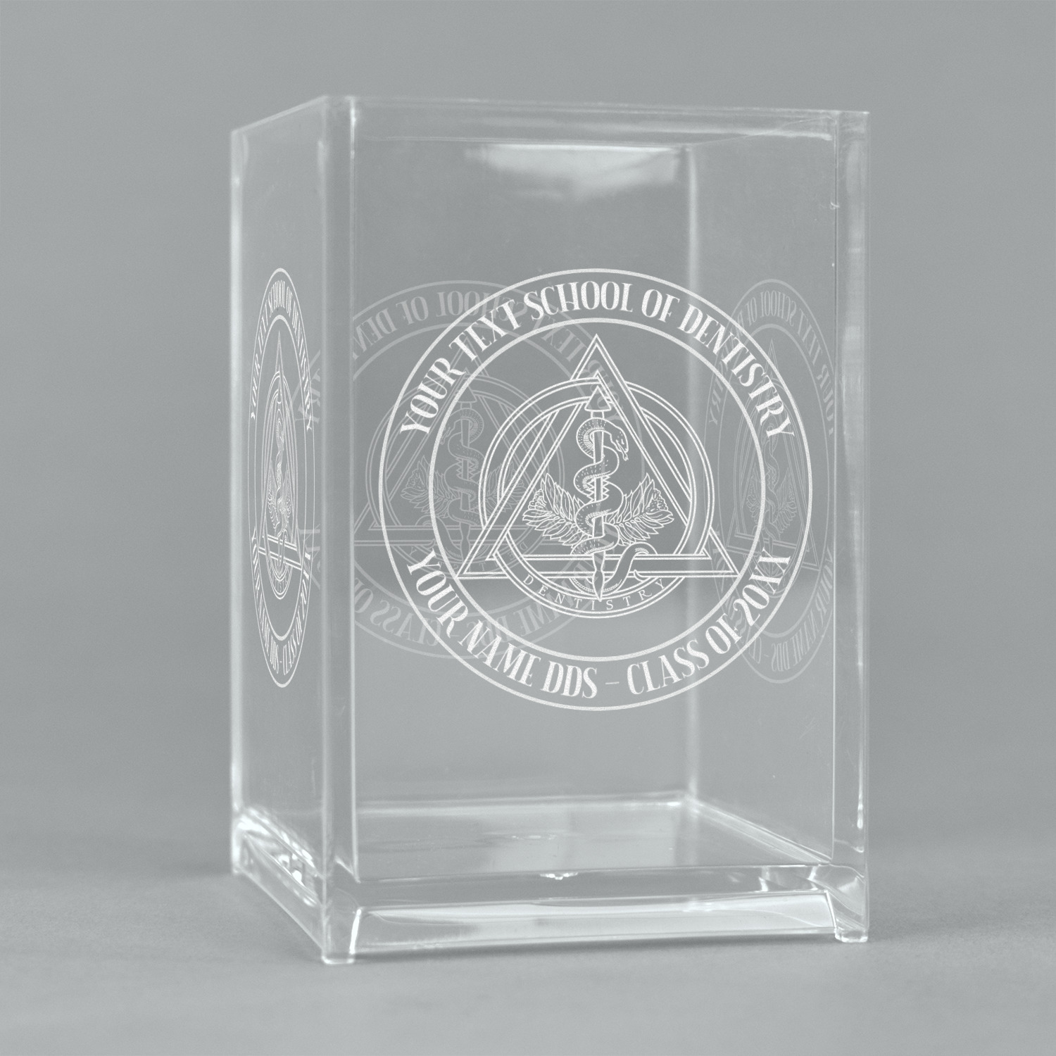 This design features the dental insignia (aka emblem, symbol, logo) at the center with personalization in a circle around the emblem.You can customize the name of the dental school, as well as the name of the dentist and the year they graduated.