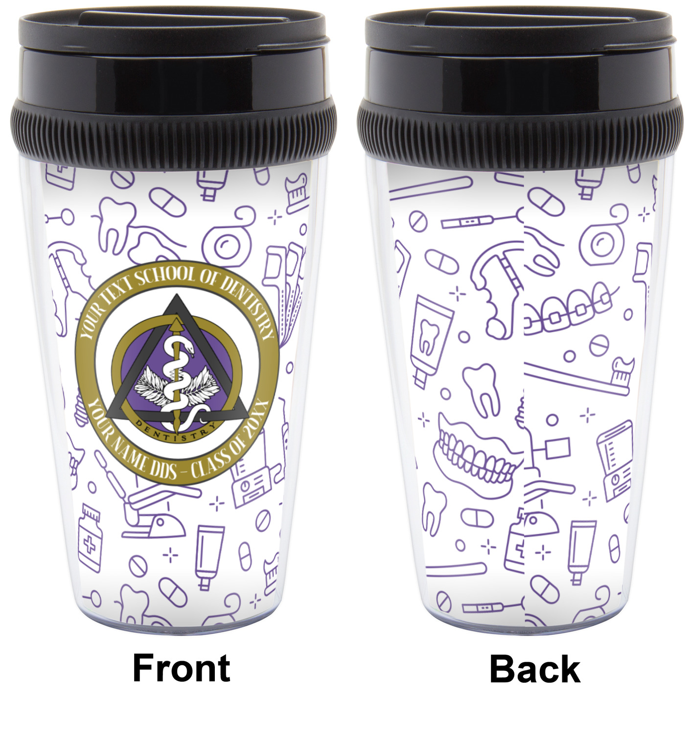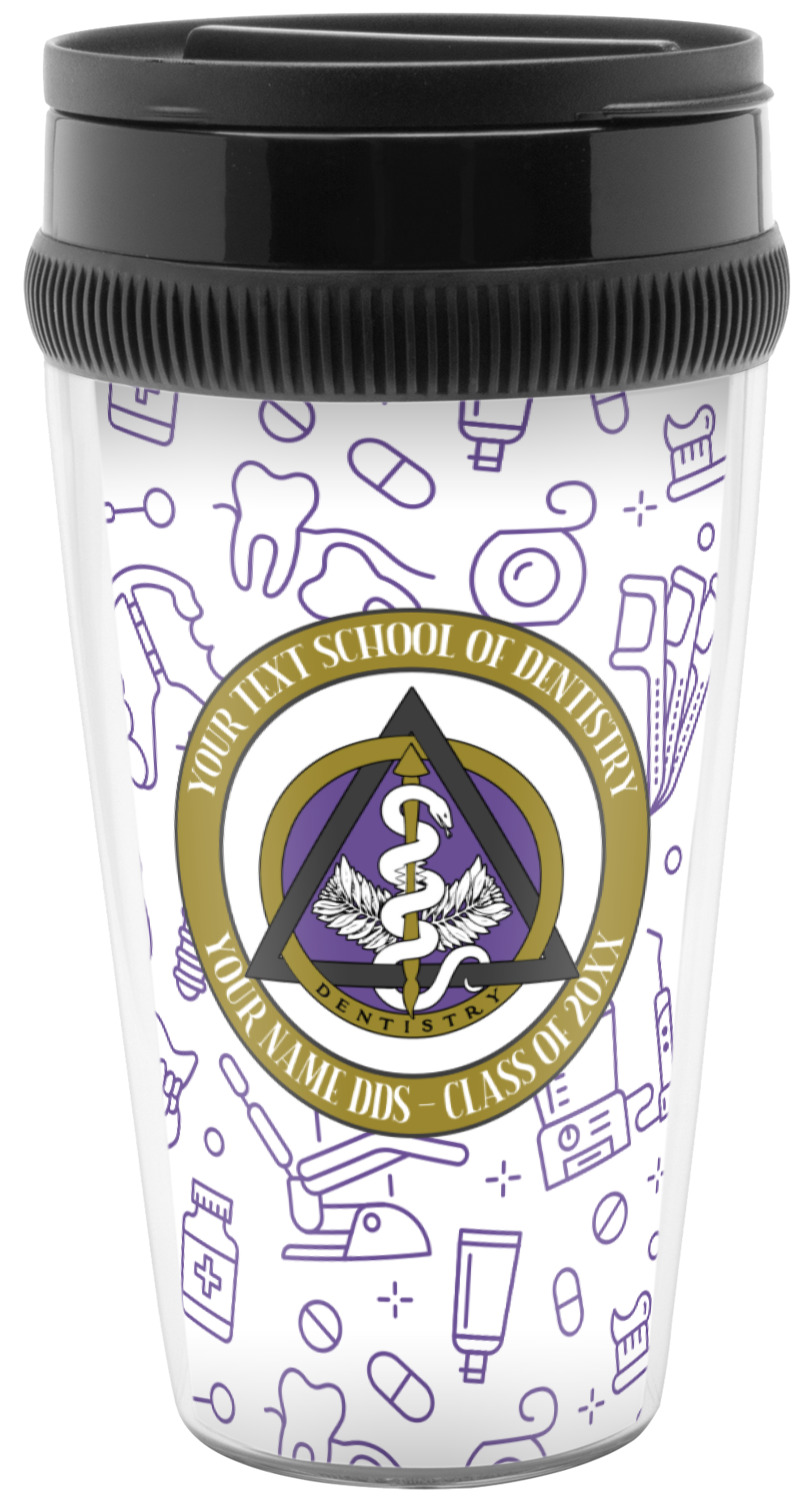 This design features the dental insignia (aka emblem, symbol, logo) at the center with personalization in a circle around the emblem.You can customize the name of the dental school, as well as the name of the dentist and the year they graduated.