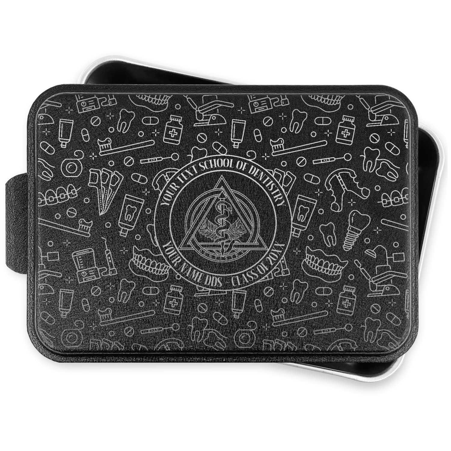 This design features the dental insignia (aka emblem, symbol, logo) at the center with personalization in a circle around the emblem.You can customize the name of the dental school, as well as the name of the dentist and the year they graduated.
