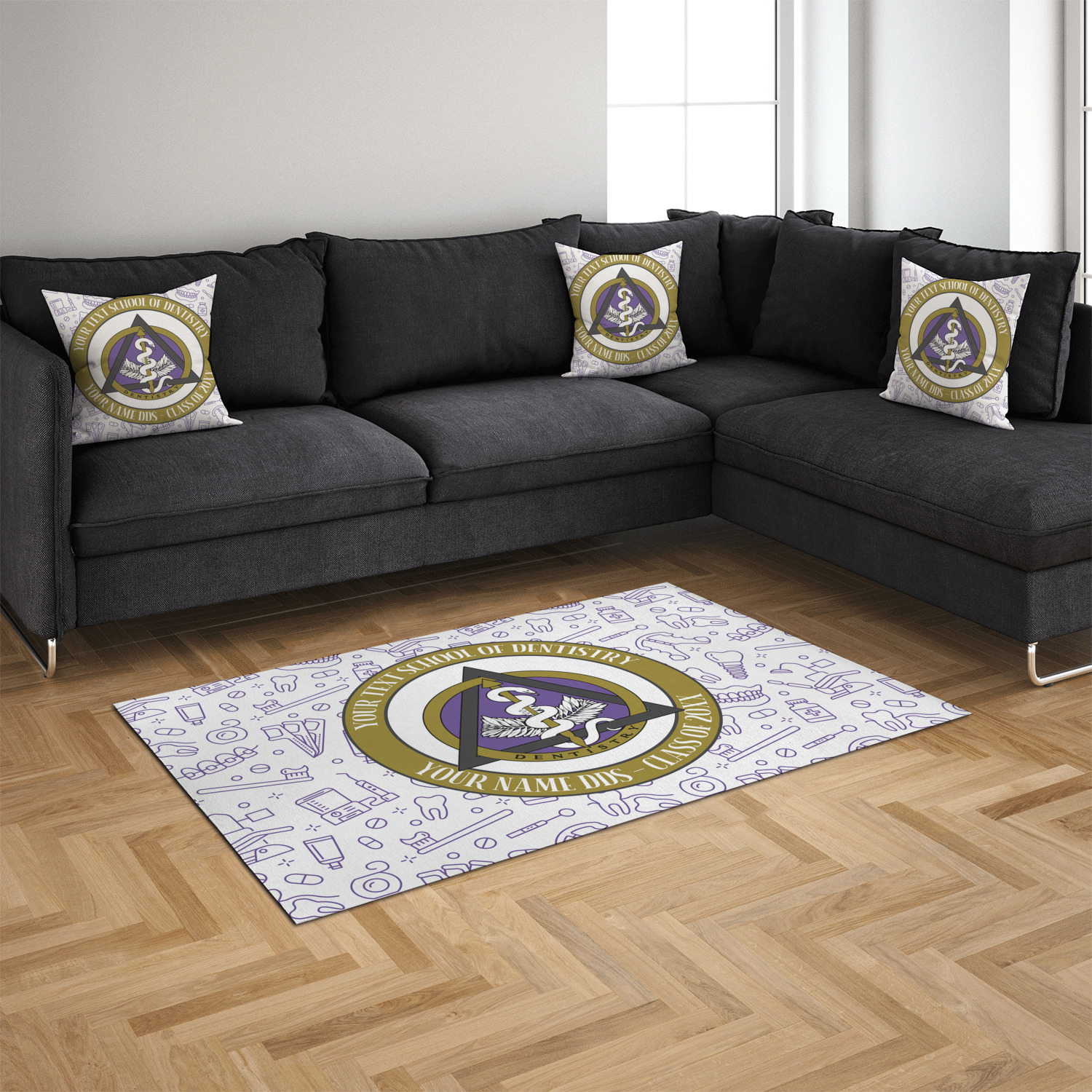 This design features the dental insignia (aka emblem, symbol, logo) at the center with personalization in a circle around the emblem.You can customize the name of the dental school, as well as the name of the dentist and the year they graduated.