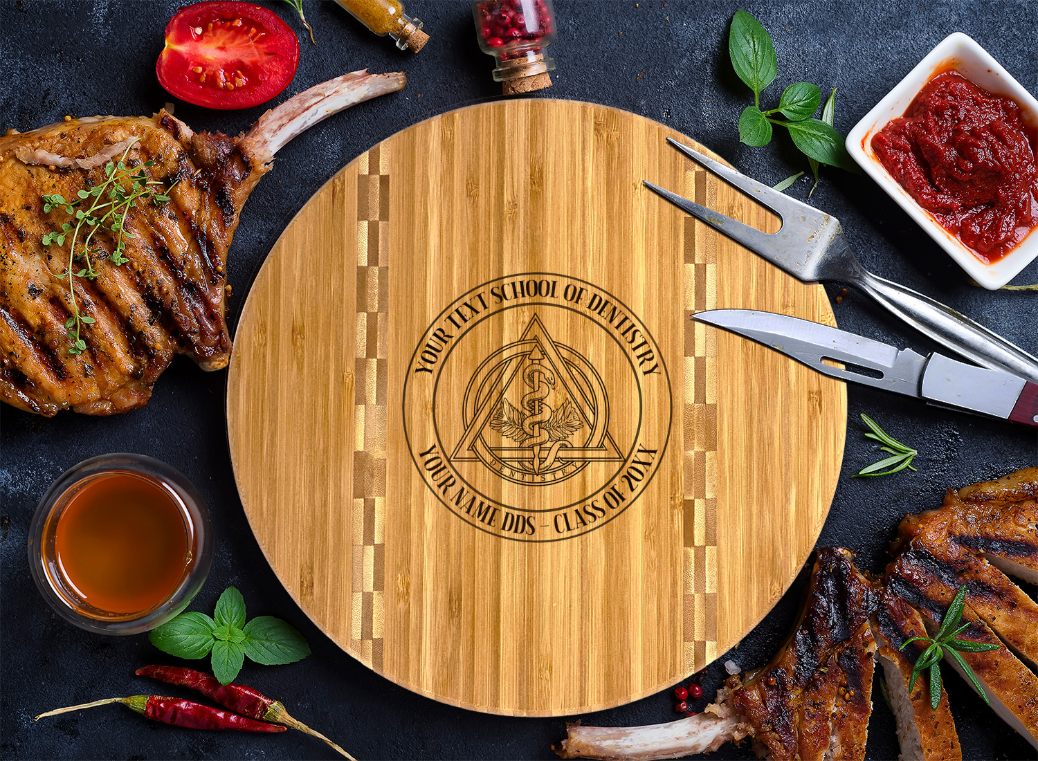 This design features the dental insignia (aka emblem, symbol, logo) at the center with personalization in a circle around the emblem.You can customize the name of the dental school, as well as the name of the dentist and the year they graduated.