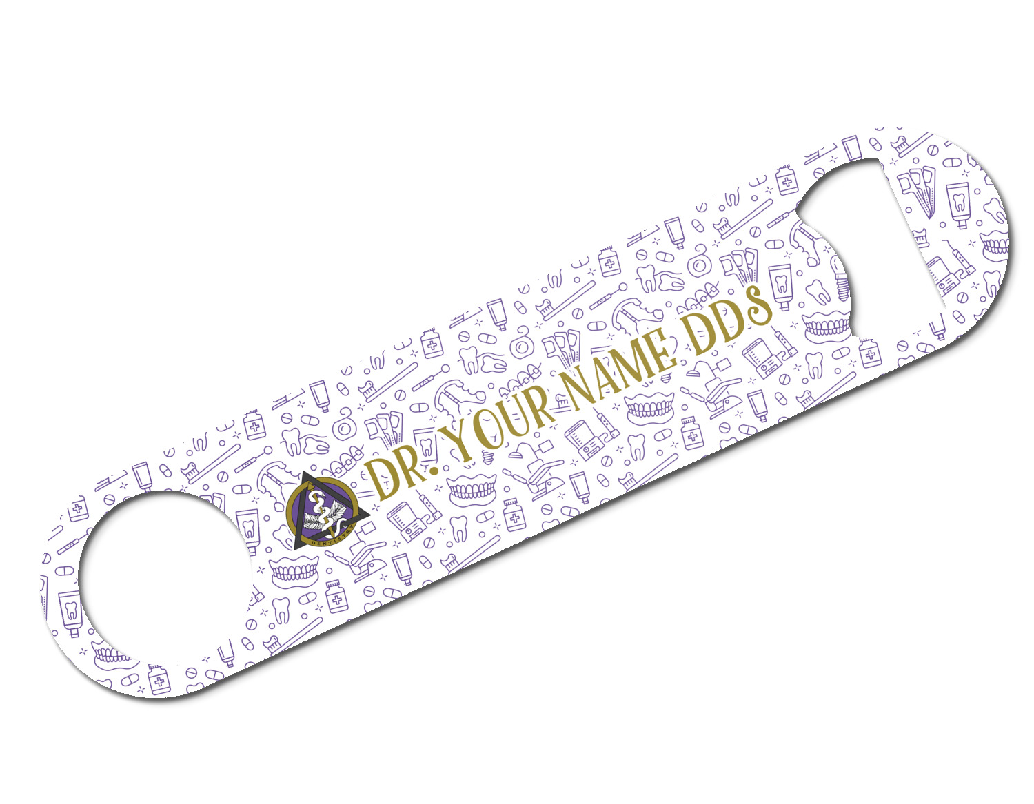 This design features the dental insignia (aka emblem, symbol, logo) at the center with personalization in a circle around the emblem.You can customize the name of the dental school, as well as the name of the dentist and the year they graduated.