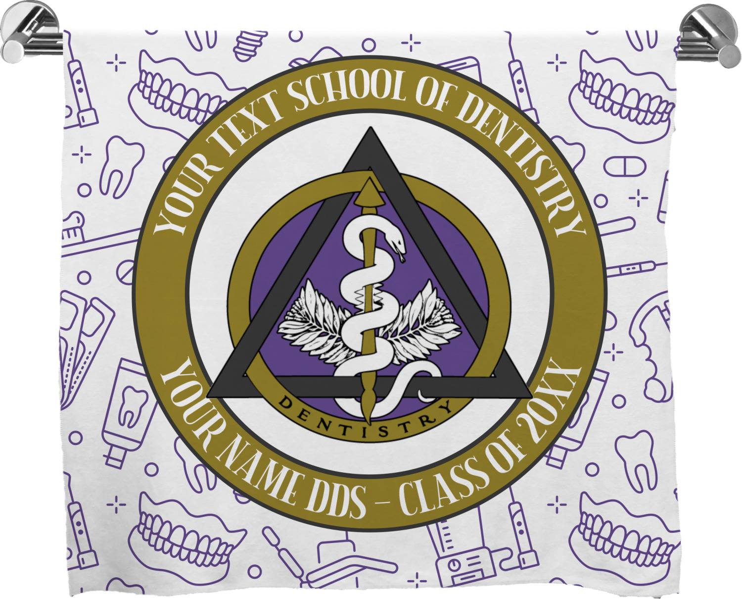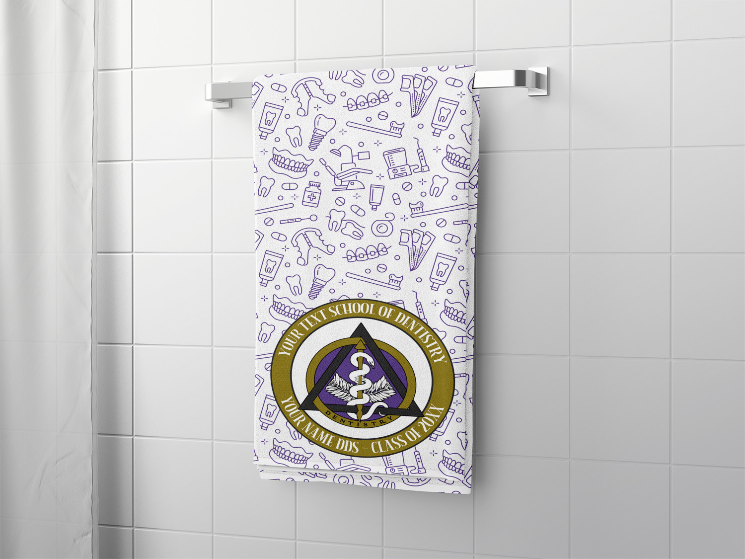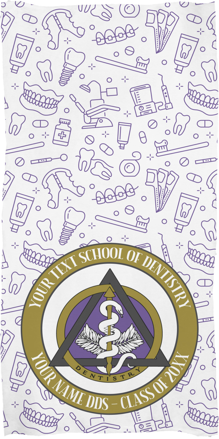 This design features the dental insignia (aka emblem, symbol, logo) at the center with personalization in a circle around the emblem.You can customize the name of the dental school, as well as the name of the dentist and the year they graduated.