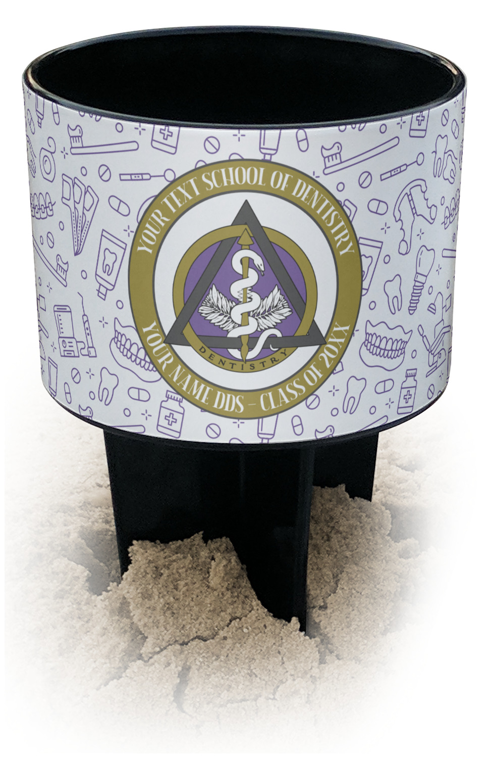 This cup holder has a large stake at its bottom that anchors it to the sand or ground below, while the cup holder rests above the stake. The entire drink holder is made of durable plastic and displays your customization around the cup holder portion. We sell these personalized beach spikers in two different colors: black and white.