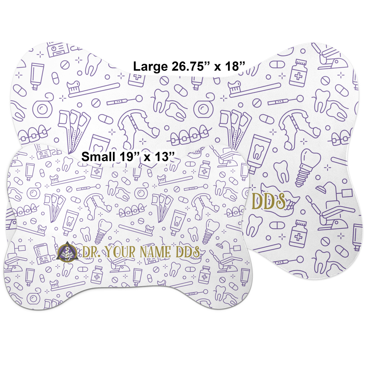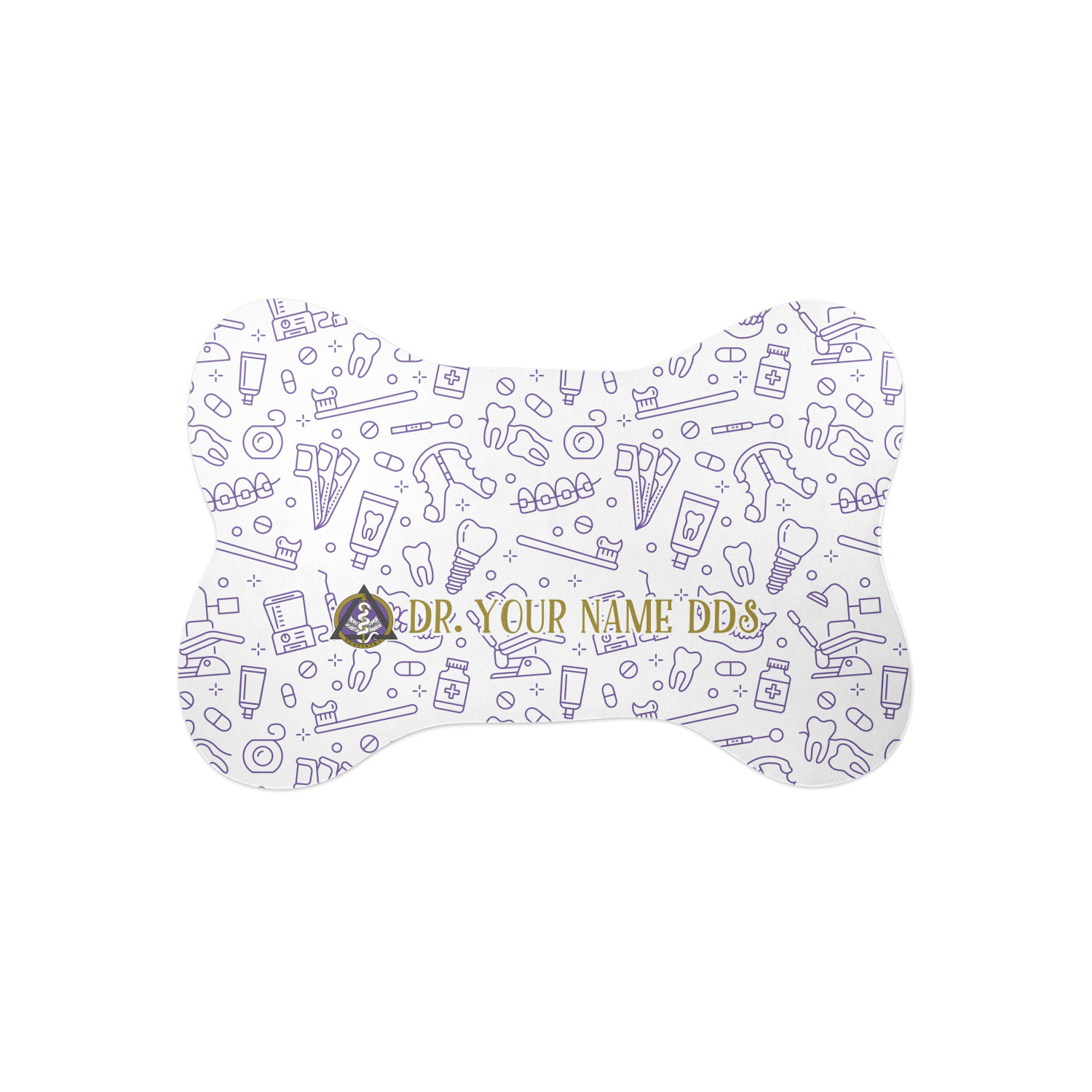 This design features the dental insignia (aka emblem, symbol, logo) at the center with personalization in a circle around the emblem.You can customize the name of the dental school, as well as the name of the dentist and the year they graduated.