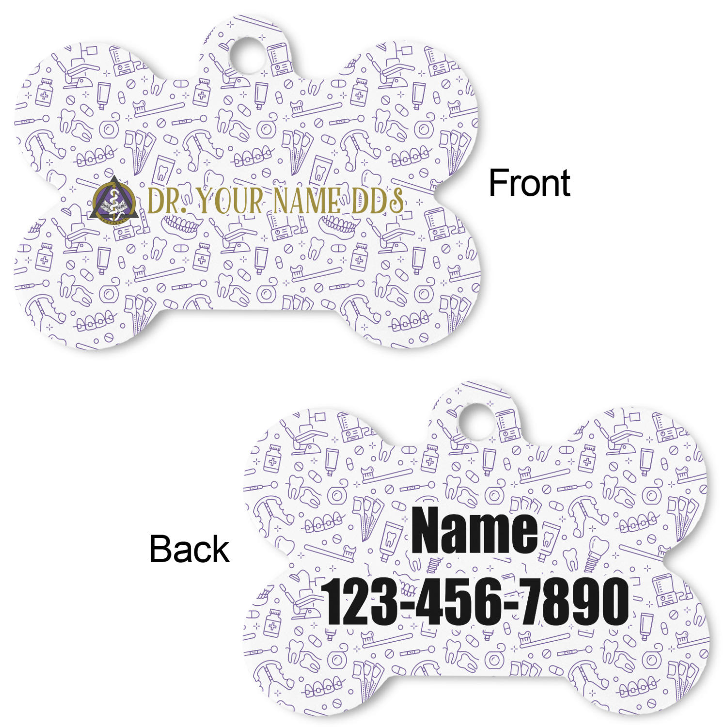 Our default design templates print your dog's personalization on the front and your contact information on the back; however everything is customizable, so you customize the patterns, the colors, the personalization, the contact information etc.