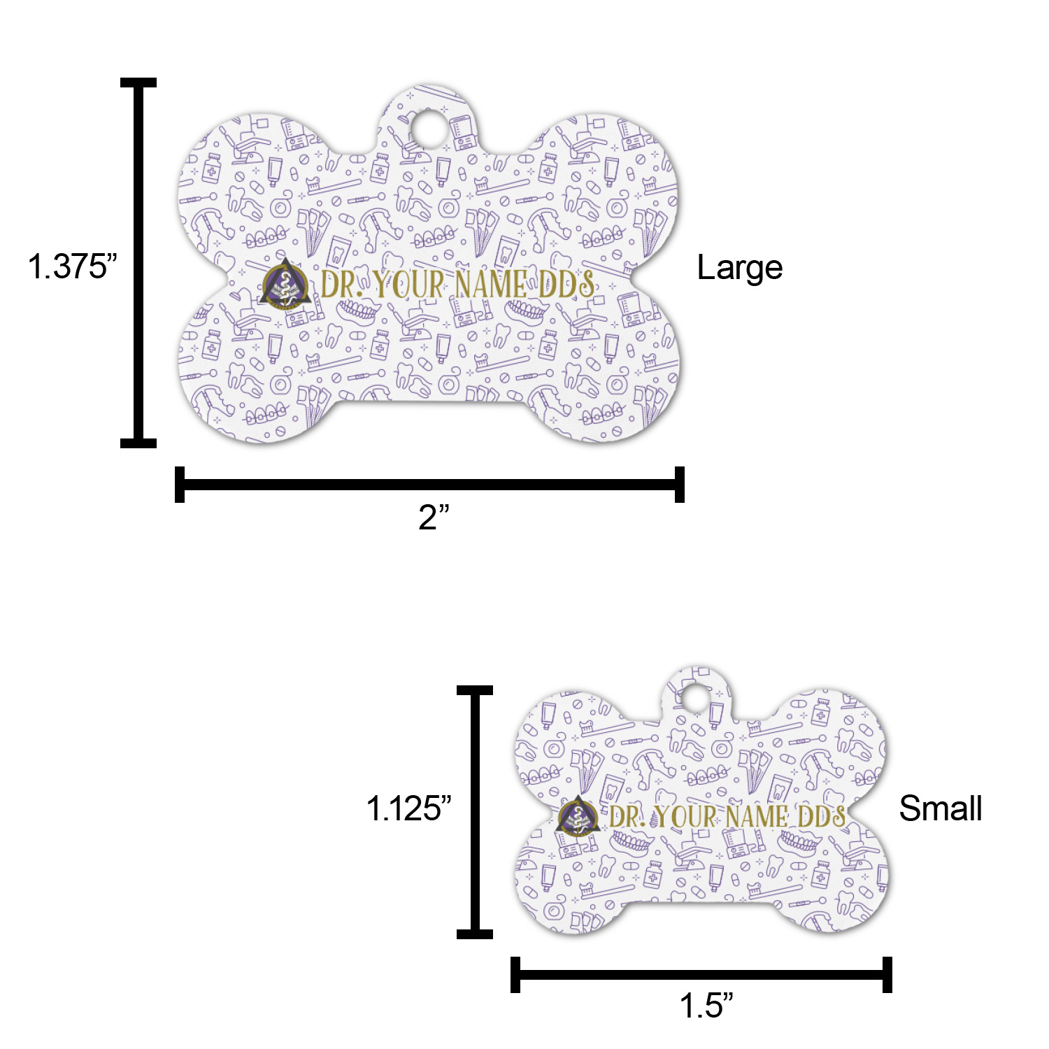 The small bone dog tag size is perfect to pair with our small dog collars, the large size pairs well with our large dog collars.