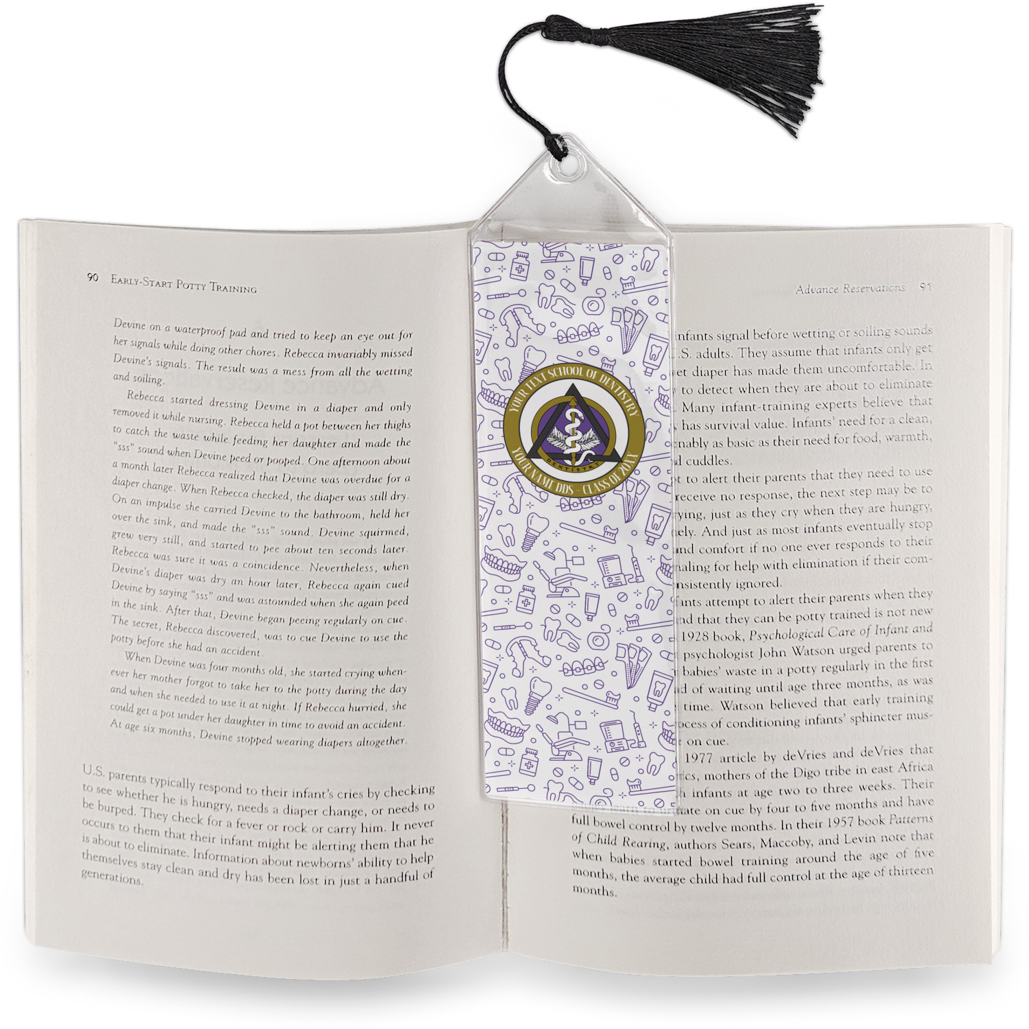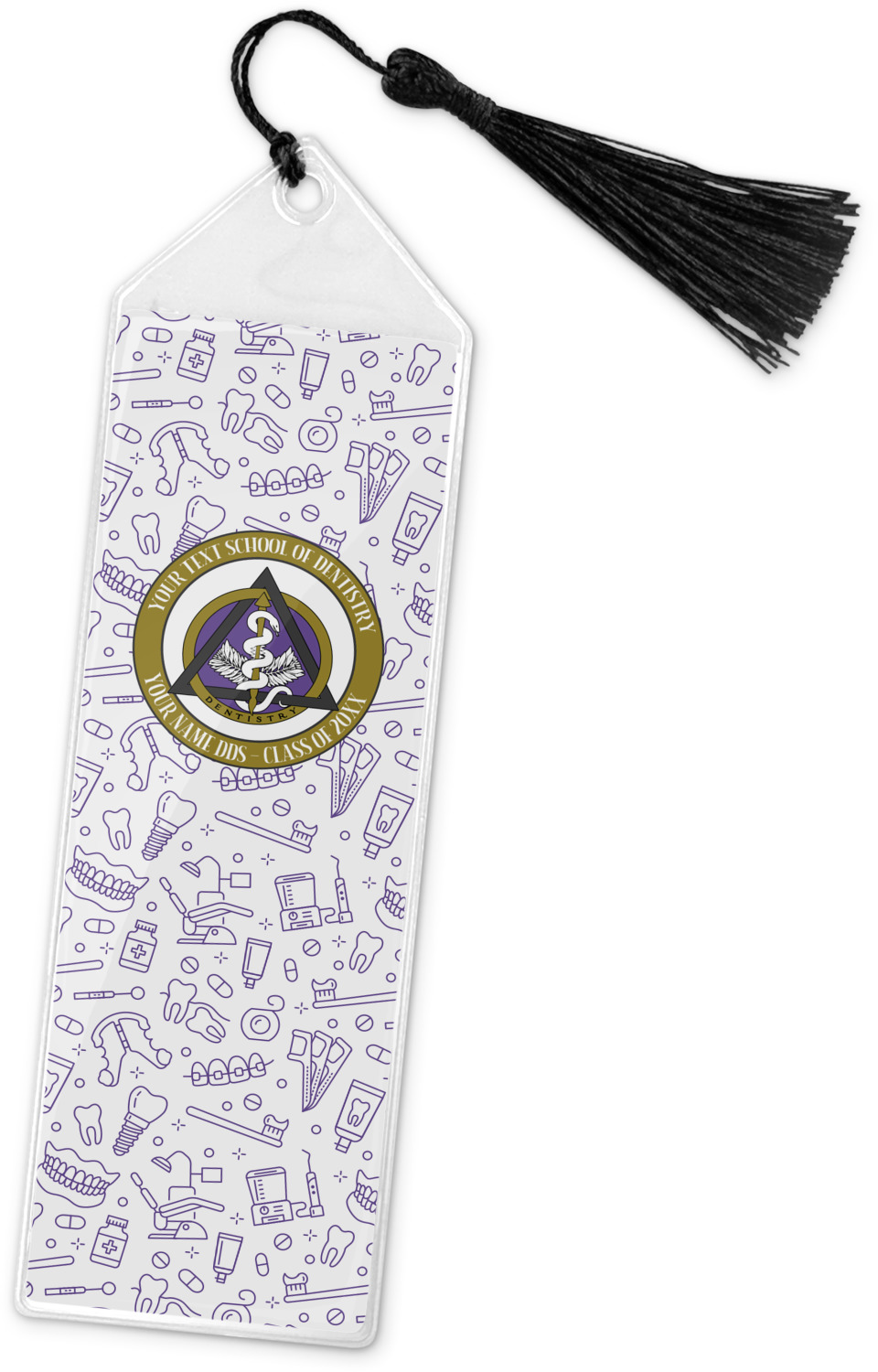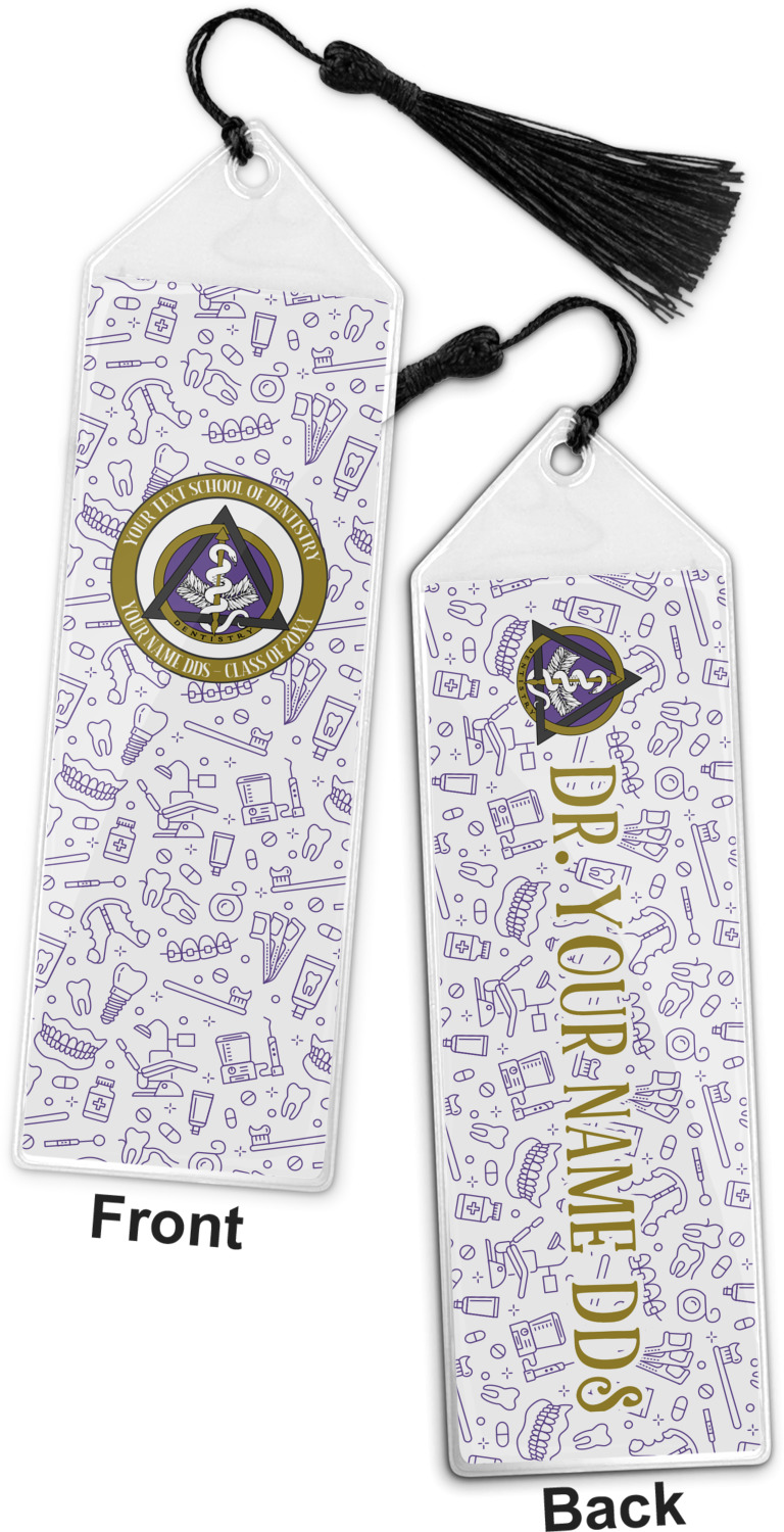 Your personalized bookmark is made of a sturdy, clear vinyl, and is approximately 7.5" x 2.25". We display your personalization on vinyl inserts that are placed on both sides. Accompanying each book marker is a black, fringe tassel that attaches to the reinforced, triangular header.
