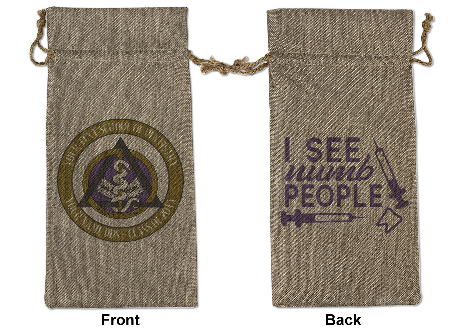 We sell our Burlap Gift Bags in 3 variant sized bags. Made with burlap polyester, each personalized bag can be secured with a twine drawstring pull. Your custom design is available to print on one side or both sides - completely up to you! The sizes of the bags measure approximately 4.5" x 6.5" for the smallest size, 6.5" x 8.0" for the medium size, and 6.5" x 13.5" for the large-sized bag.