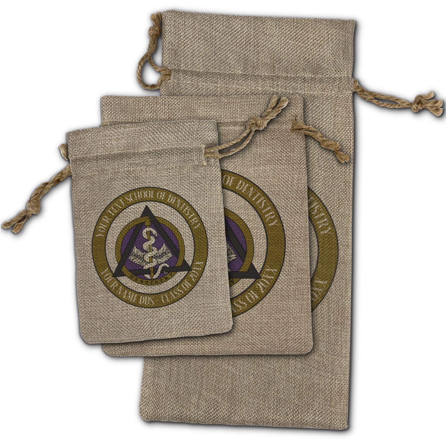 We sell our Burlap Gift Bags in 3 variant sized bags. Made with burlap polyester, each personalized bag can be secured with a twine drawstring pull. Your custom design is available to print on one side or both sides - completely up to you! The sizes of the bags measure approximately 4.5" x 6.5" for the smallest size, 6.5" x 8.0" for the medium size, and 6.5" x 13.5" for the large-sized bag.
