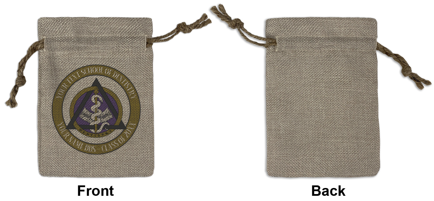 We sell our Burlap Gift Bags in 3 variant sized bags. Made with burlap polyester, each personalized bag can be secured with a twine drawstring pull. Your custom design is available to print on one side or both sides - completely up to you! The sizes of the bags measure approximately 4.5" x 6.5" for the smallest size, 6.5" x 8.0" for the medium size, and 6.5" x 13.5" for the large-sized bag.