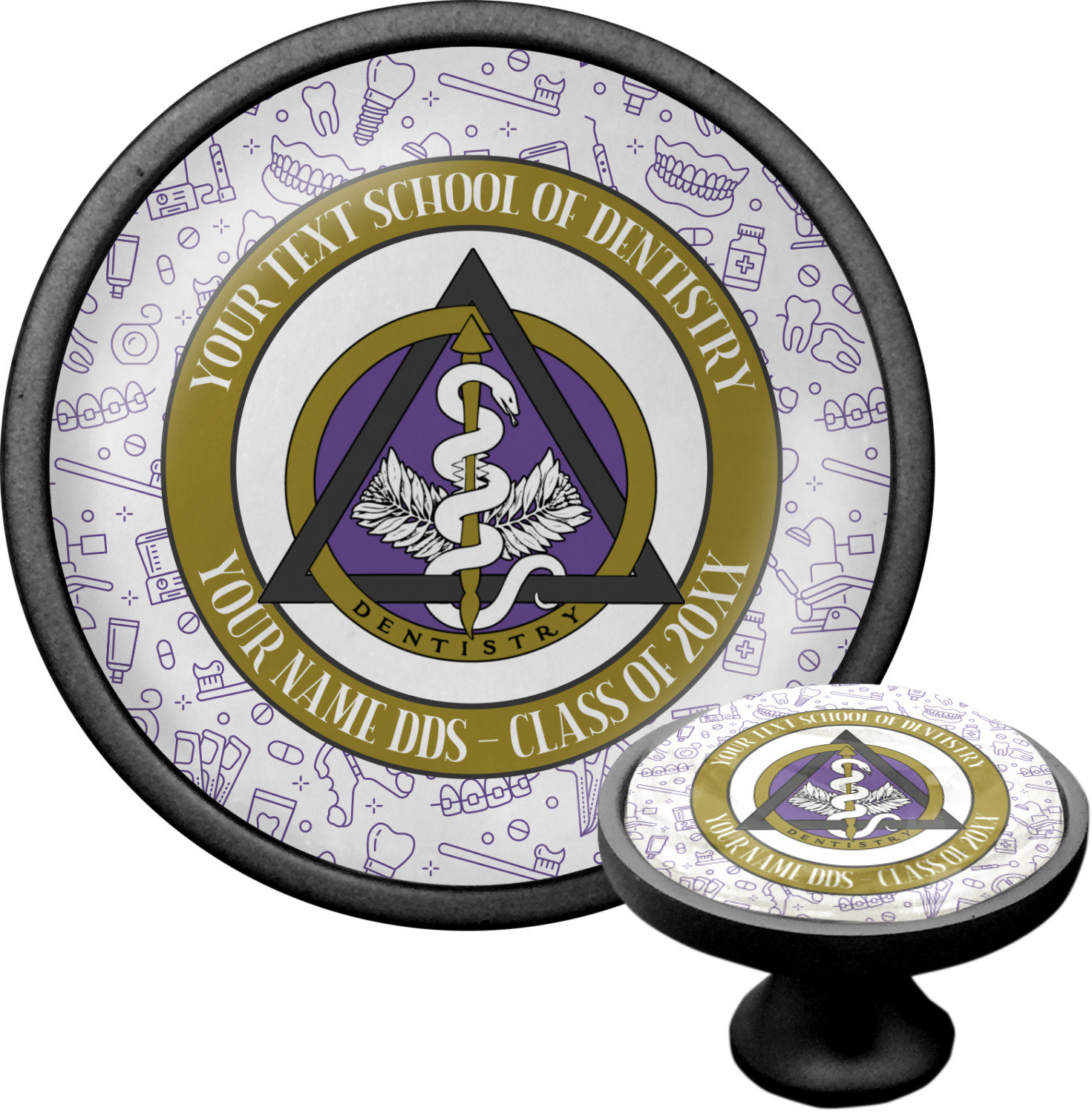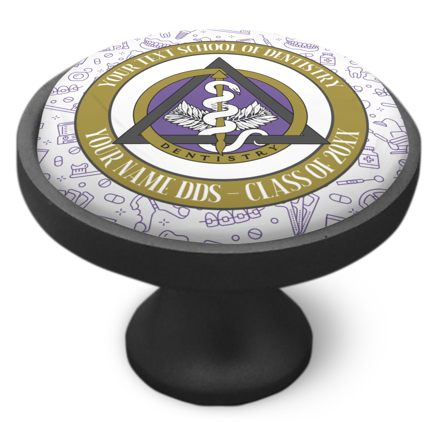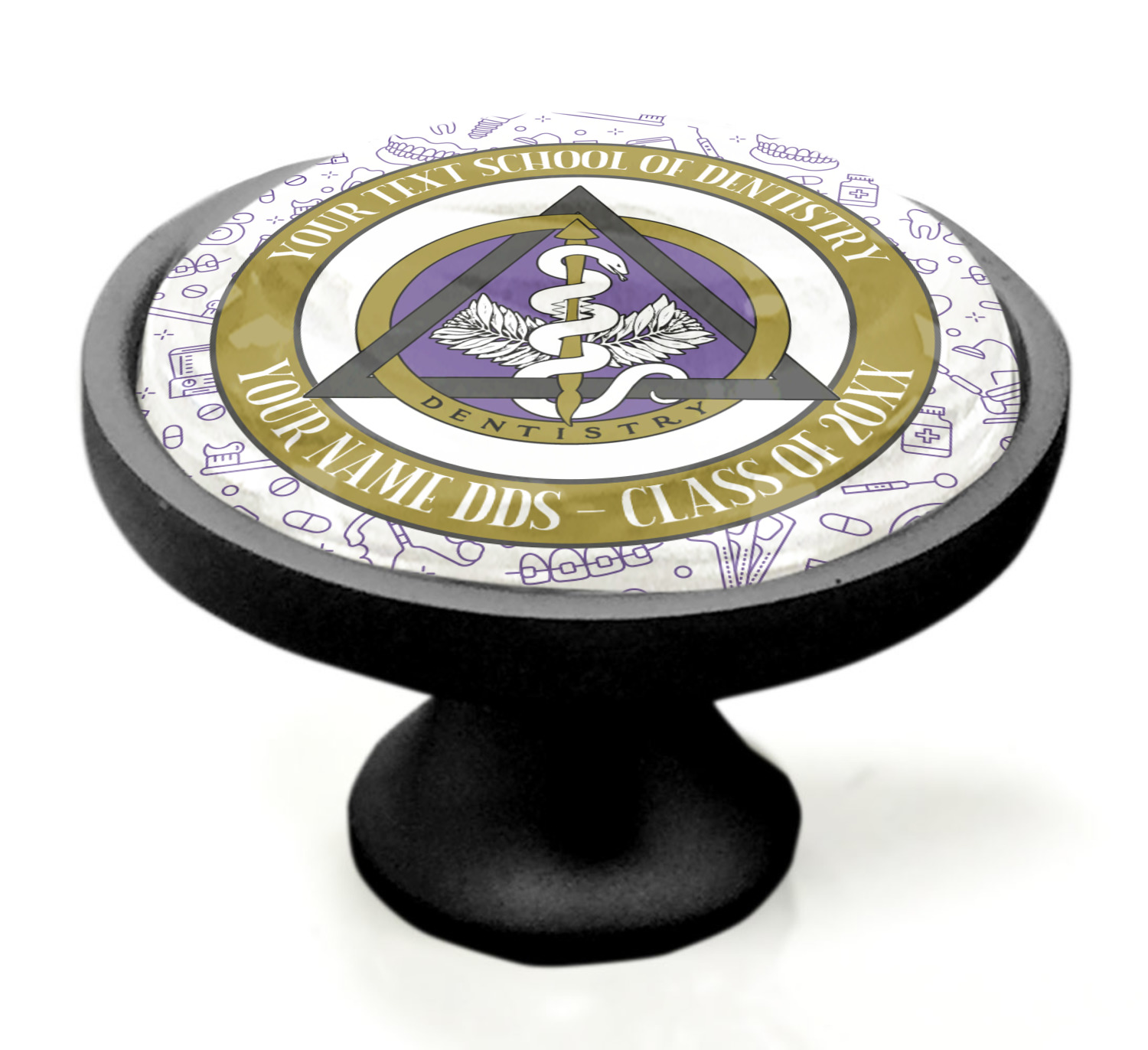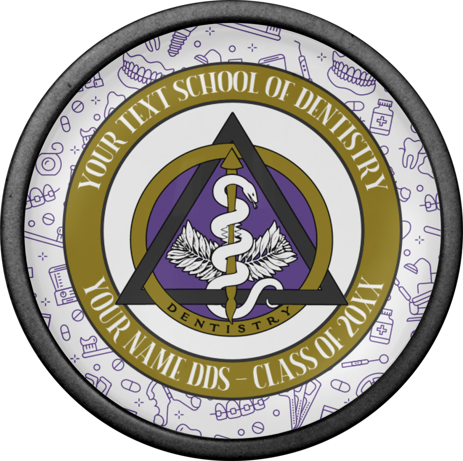 This design features the dental insignia (aka emblem, symbol, logo) at the center with personalization in a circle around the emblem.You can customize the name of the dental school, as well as the name of the dentist and the year they graduated.