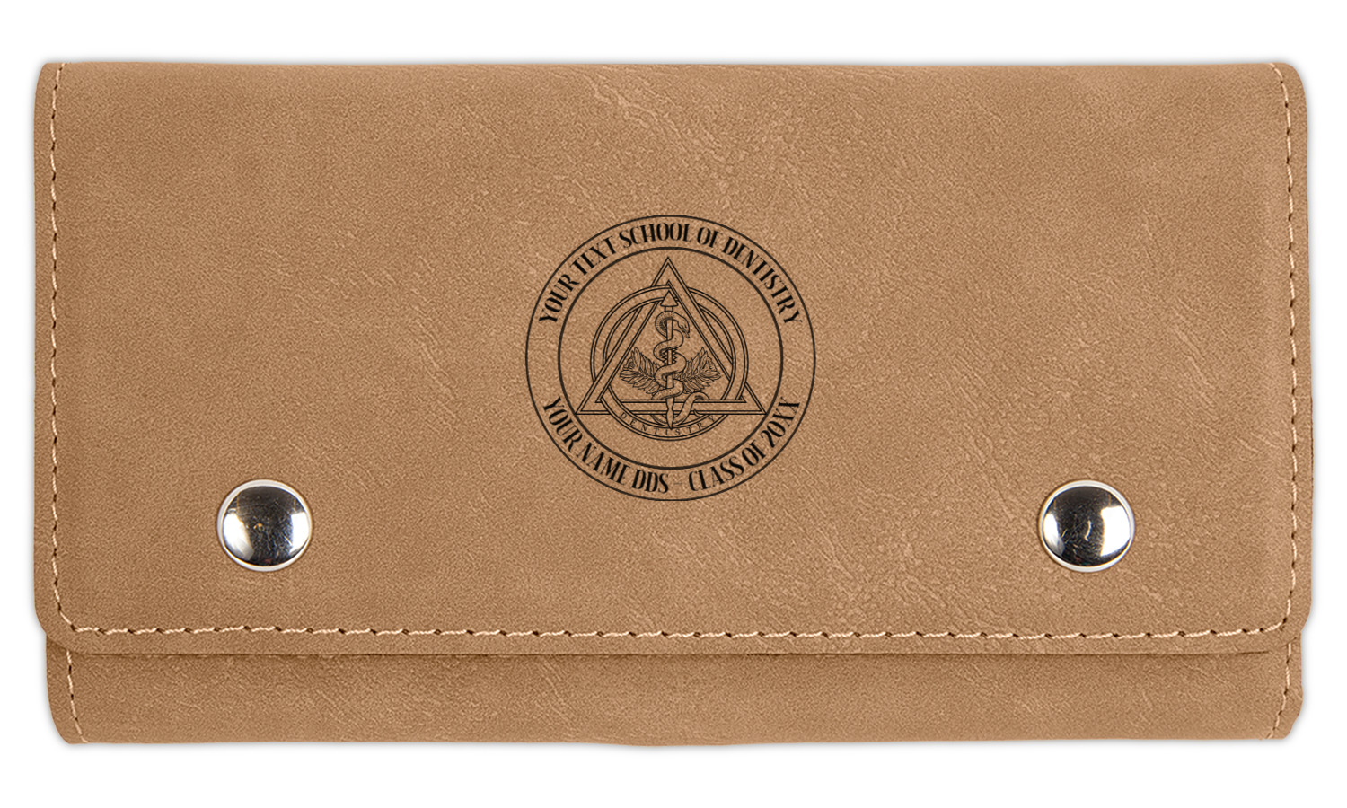 This design features the dental insignia (aka emblem, symbol, logo) at the center with personalization in a circle around the emblem.You can customize the name of the dental school, as well as the name of the dentist and the year they graduated.