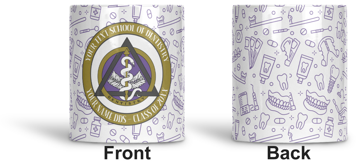 This design features the dental insignia (aka emblem, symbol, logo) at the center with personalization in a circle around the emblem.You can customize the name of the dental school, as well as the name of the dentist and the year they graduated.
