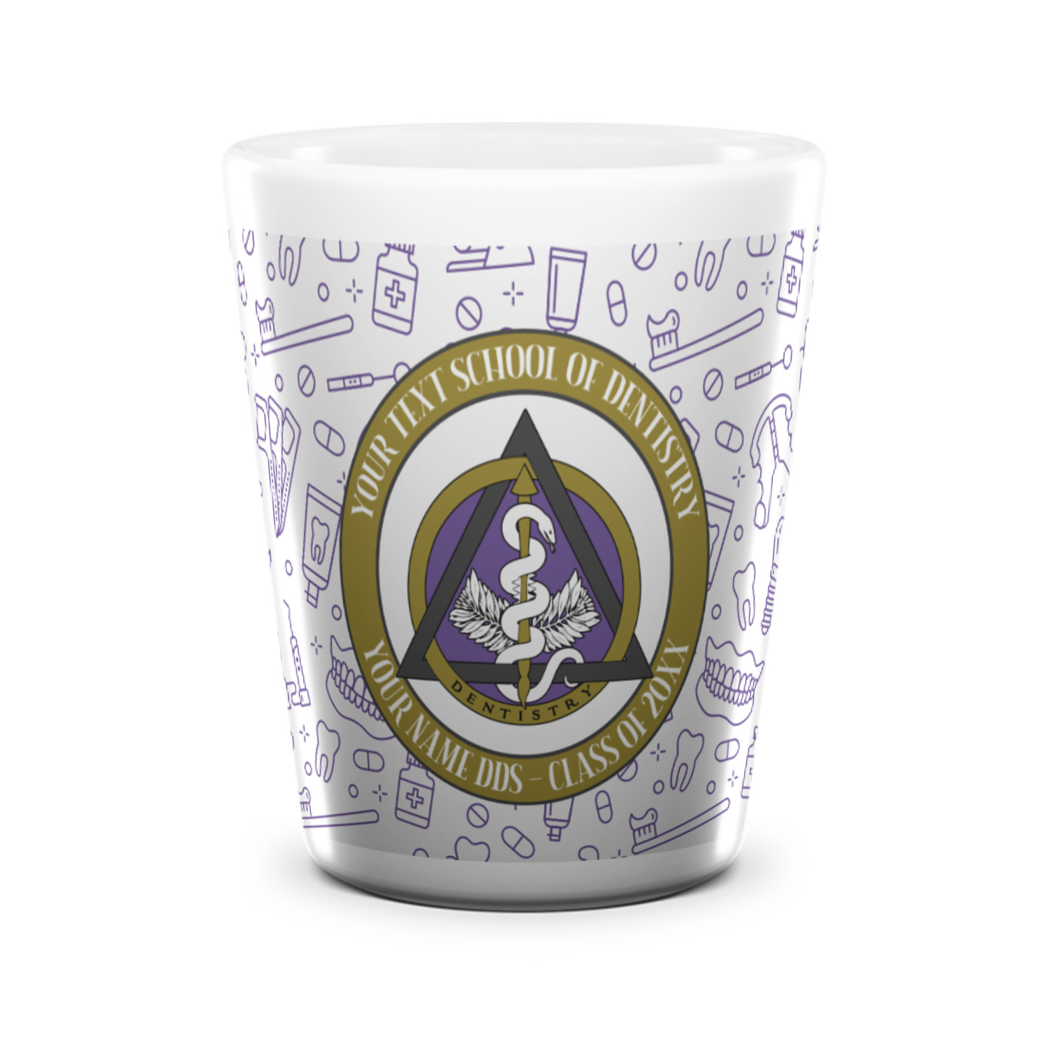 This design features the dental insignia (aka emblem, symbol, logo) at the center with personalization in a circle around the emblem.You can customize the name of the dental school, as well as the name of the dentist and the year they graduated.