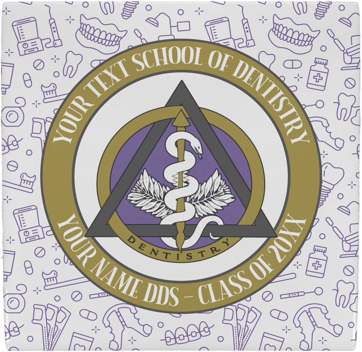 This design features the dental insignia (aka emblem, symbol, logo) at the center with personalization in a circle around the emblem.You can customize the name of the dental school, as well as the name of the dentist and the year they graduated.