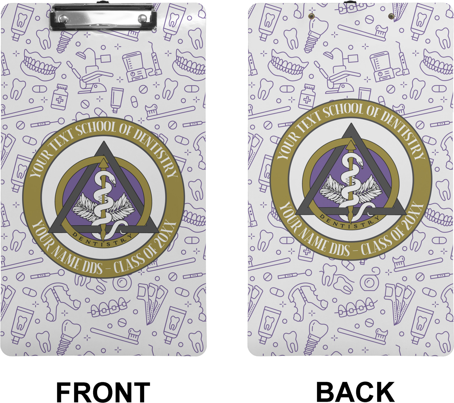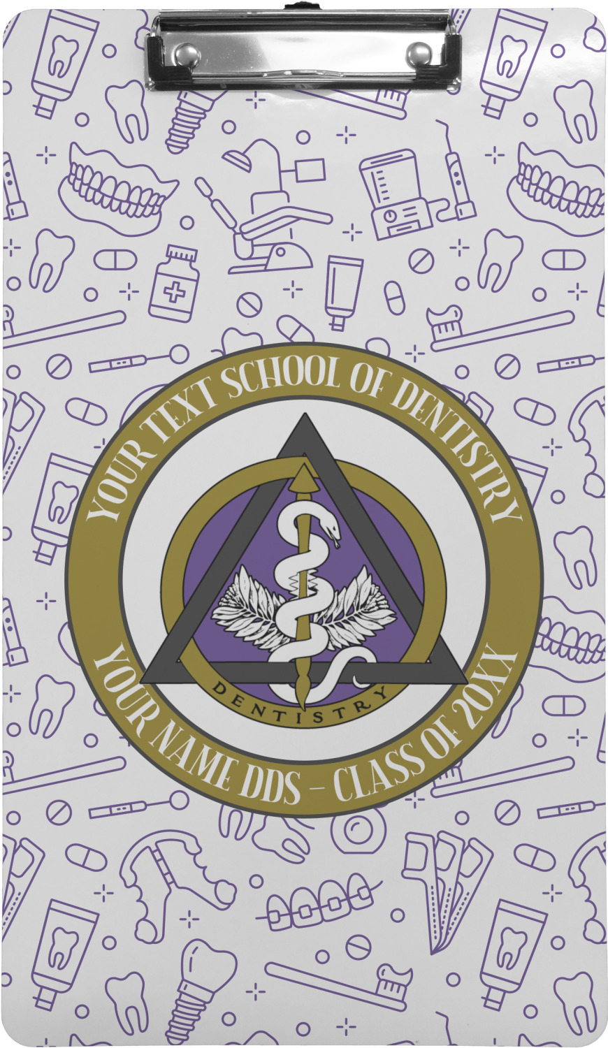 This design features the dental insignia (aka emblem, symbol, logo) at the center with personalization in a circle around the emblem.You can customize the name of the dental school, as well as the name of the dentist and the year they graduated.