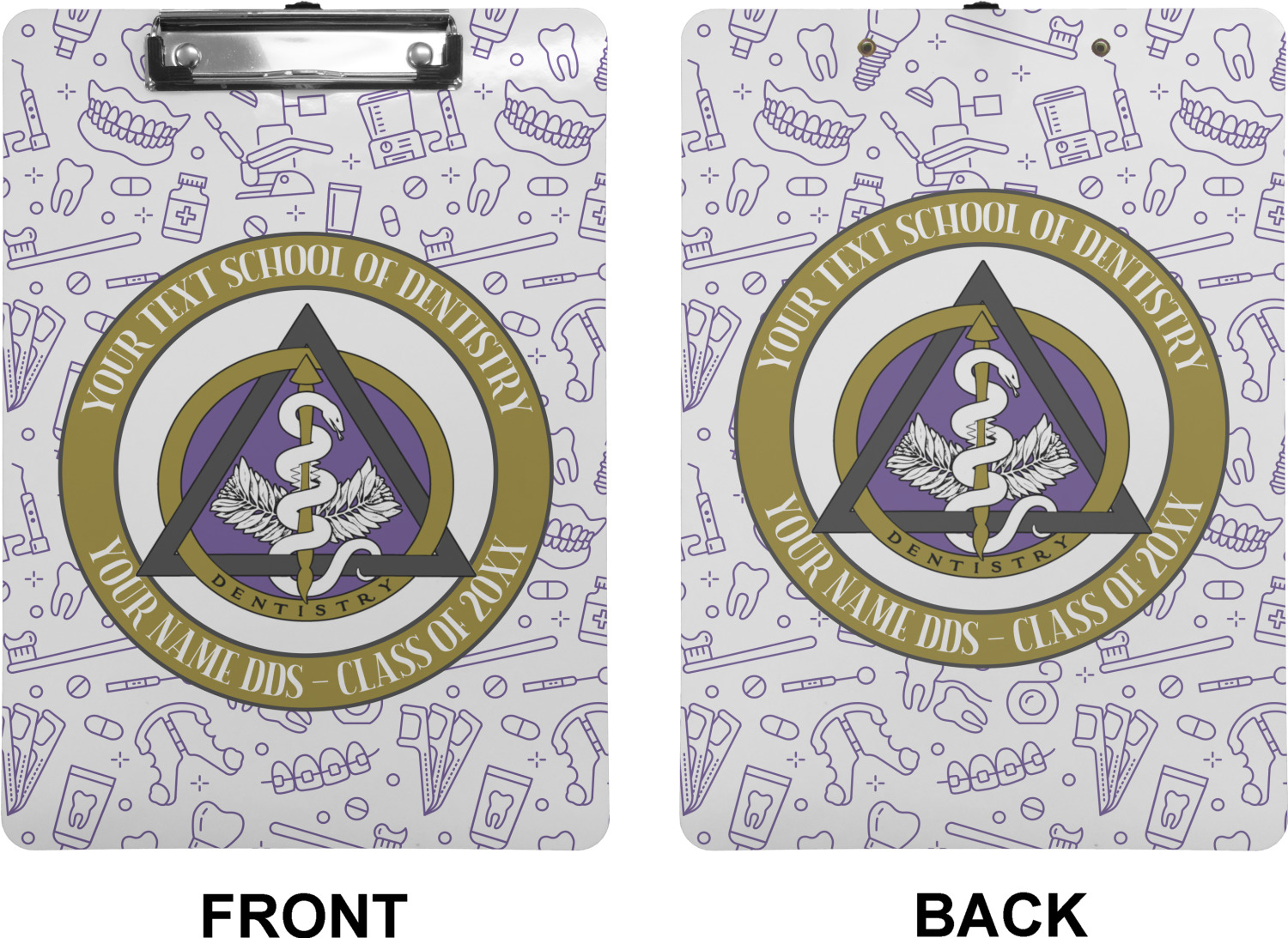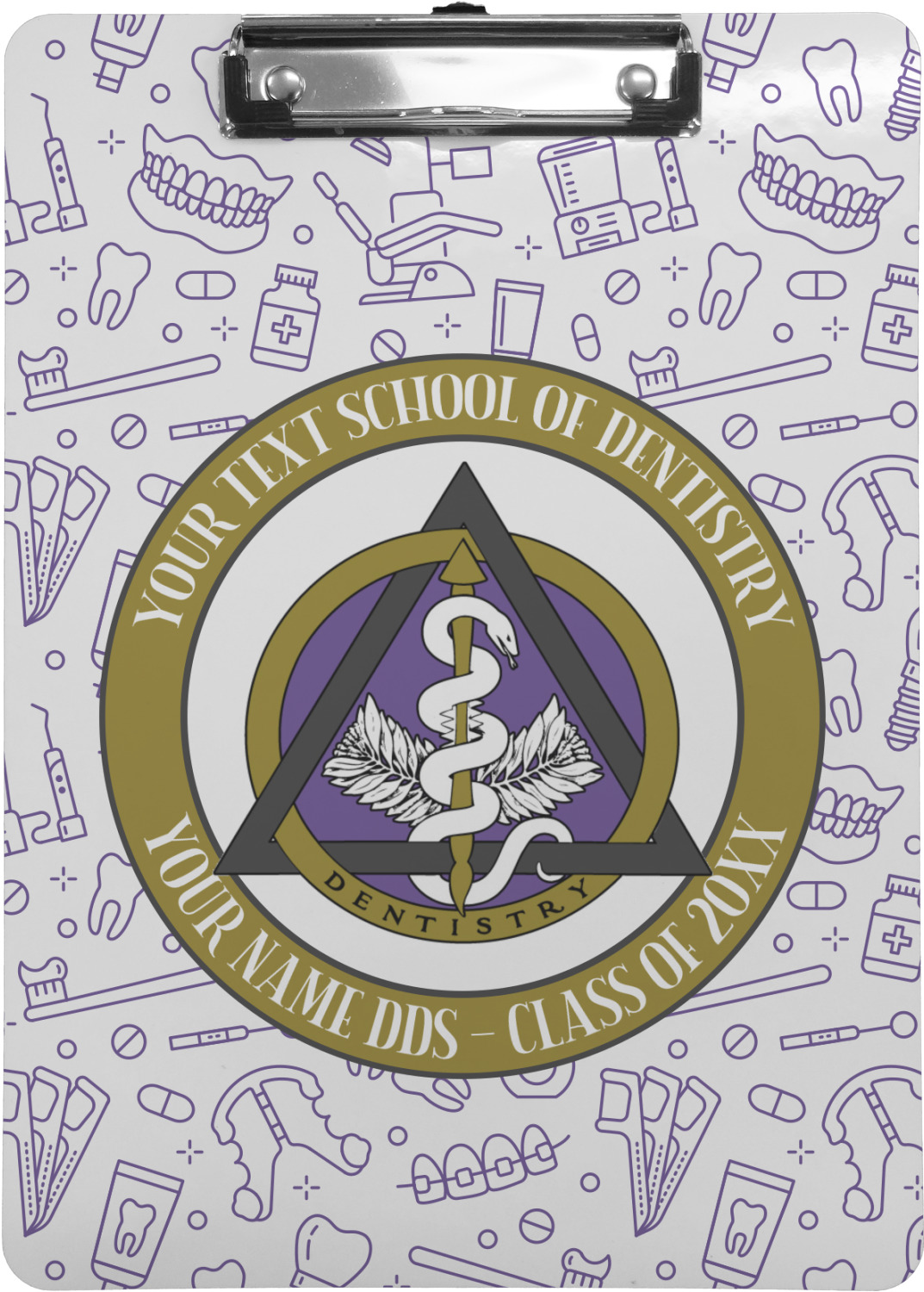 This design features the dental insignia (aka emblem, symbol, logo) at the center with personalization in a circle around the emblem.You can customize the name of the dental school, as well as the name of the dentist and the year they graduated.