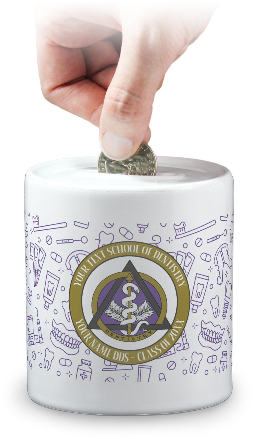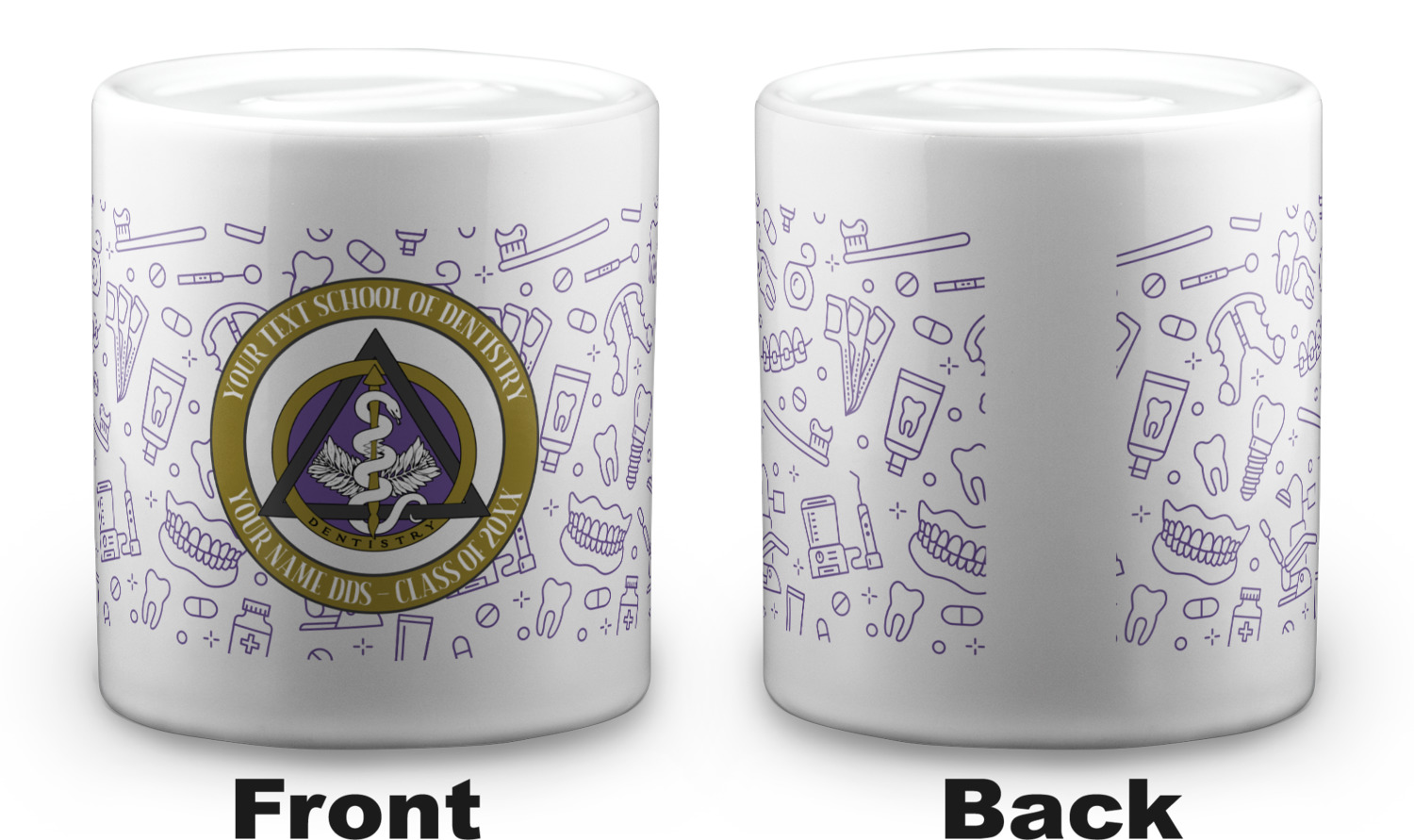 This design features the dental insignia (aka emblem, symbol, logo) at the center with personalization in a circle around the emblem.You can customize the name of the dental school, as well as the name of the dentist and the year they graduated.