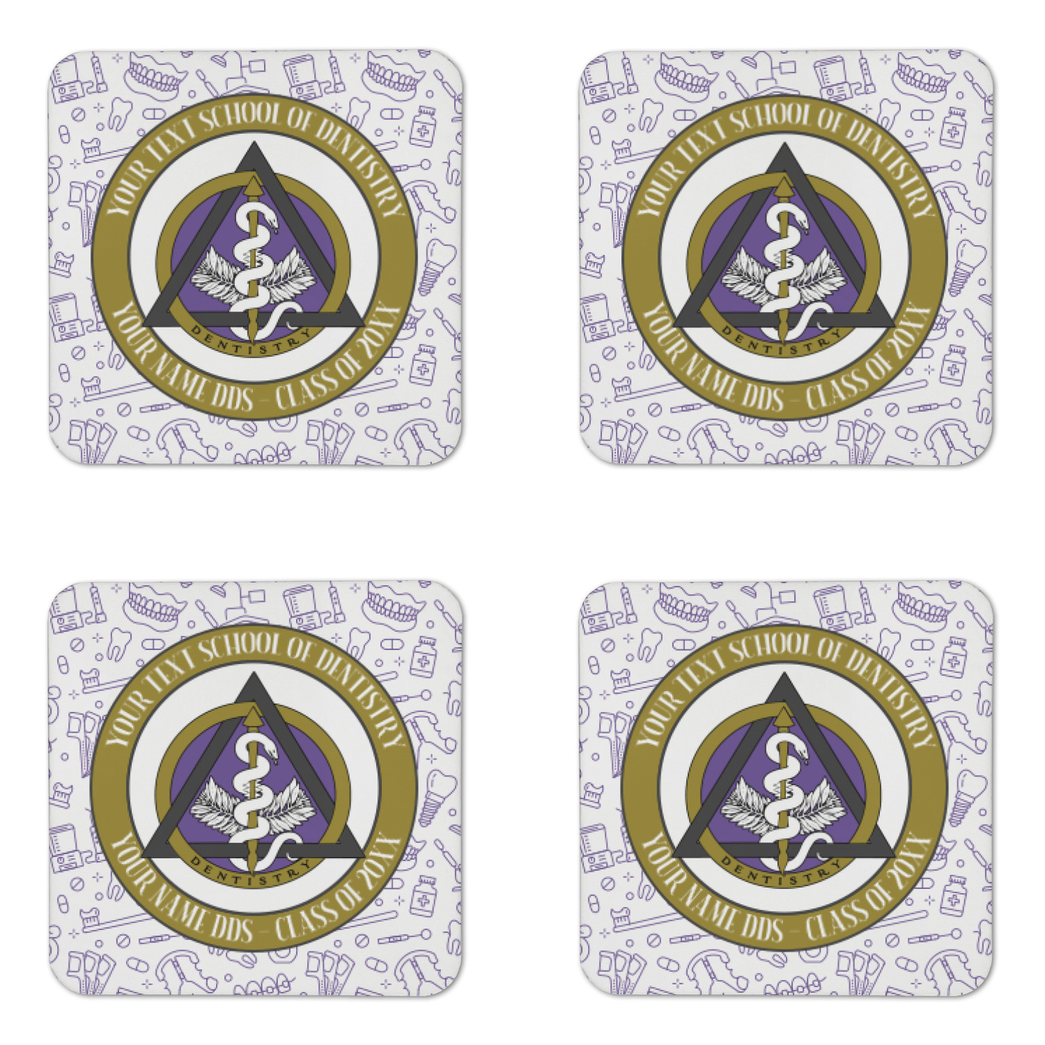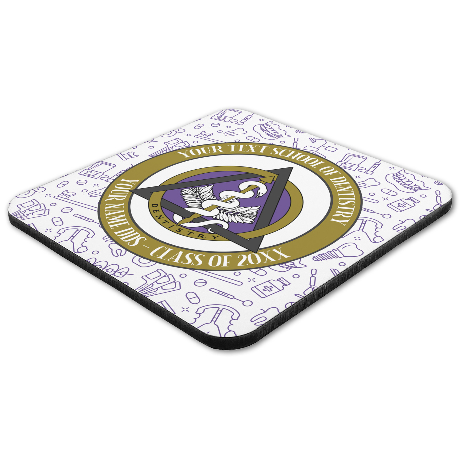 This design features the dental insignia (aka emblem, symbol, logo) at the center with personalization in a circle around the emblem.You can customize the name of the dental school, as well as the name of the dentist and the year they graduated.