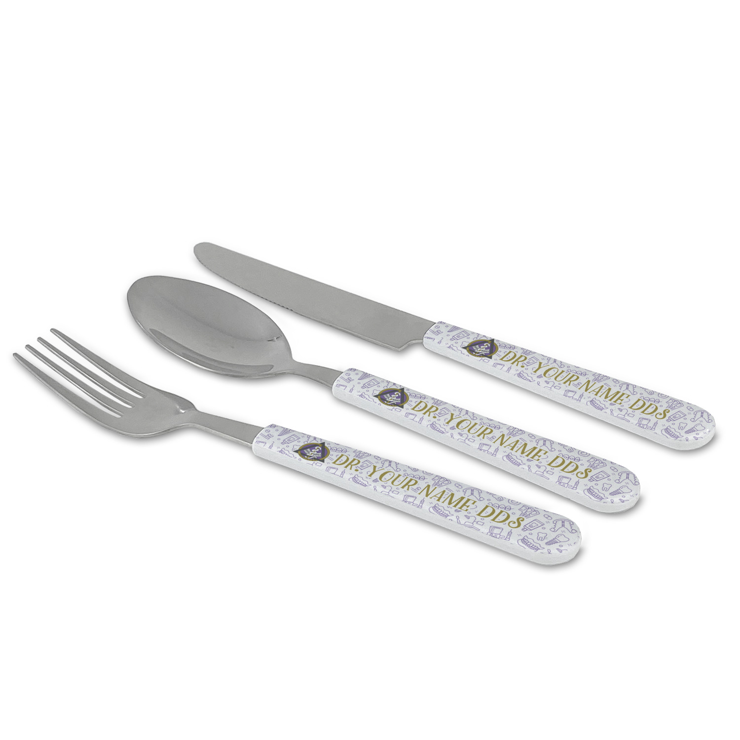 This set features a fork, a spoon and a knife. The fork has 4 prongs, the spoon is a nice size for adults and the knife has a short serrated section for cutting as well as a smooth section for spreading. The pieces in this silverware set are crafted from Stainless Steel with a durable plastic handle.