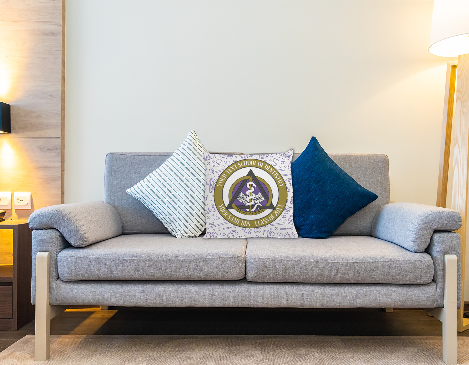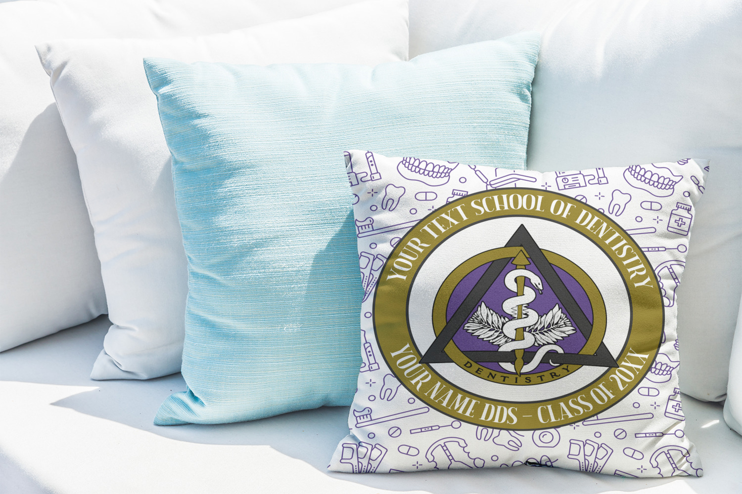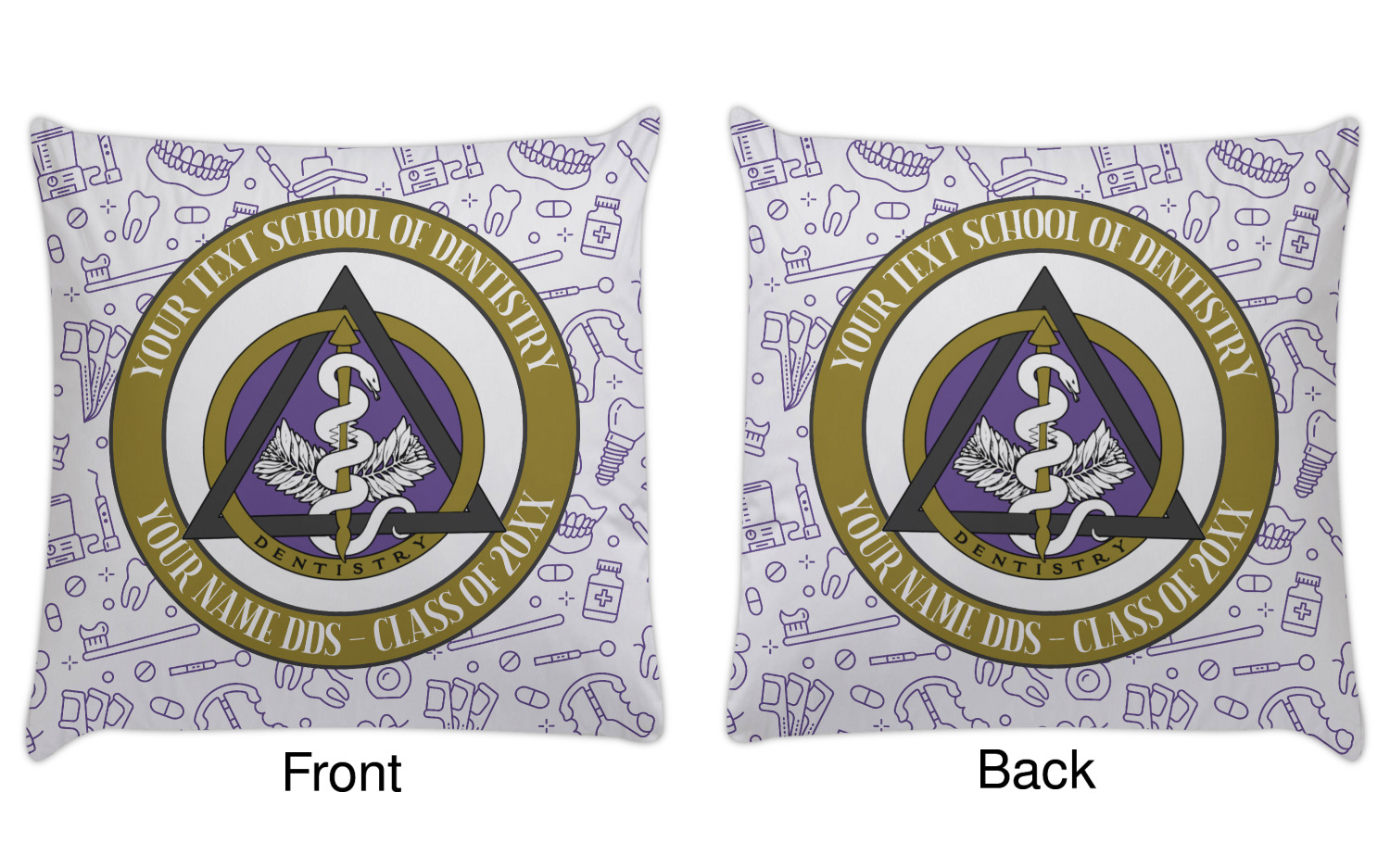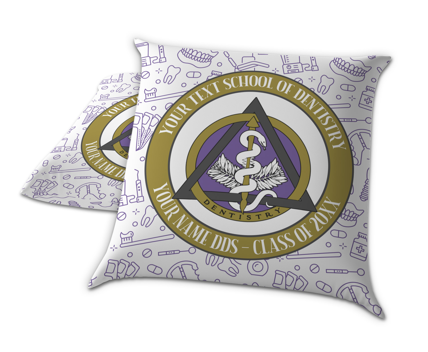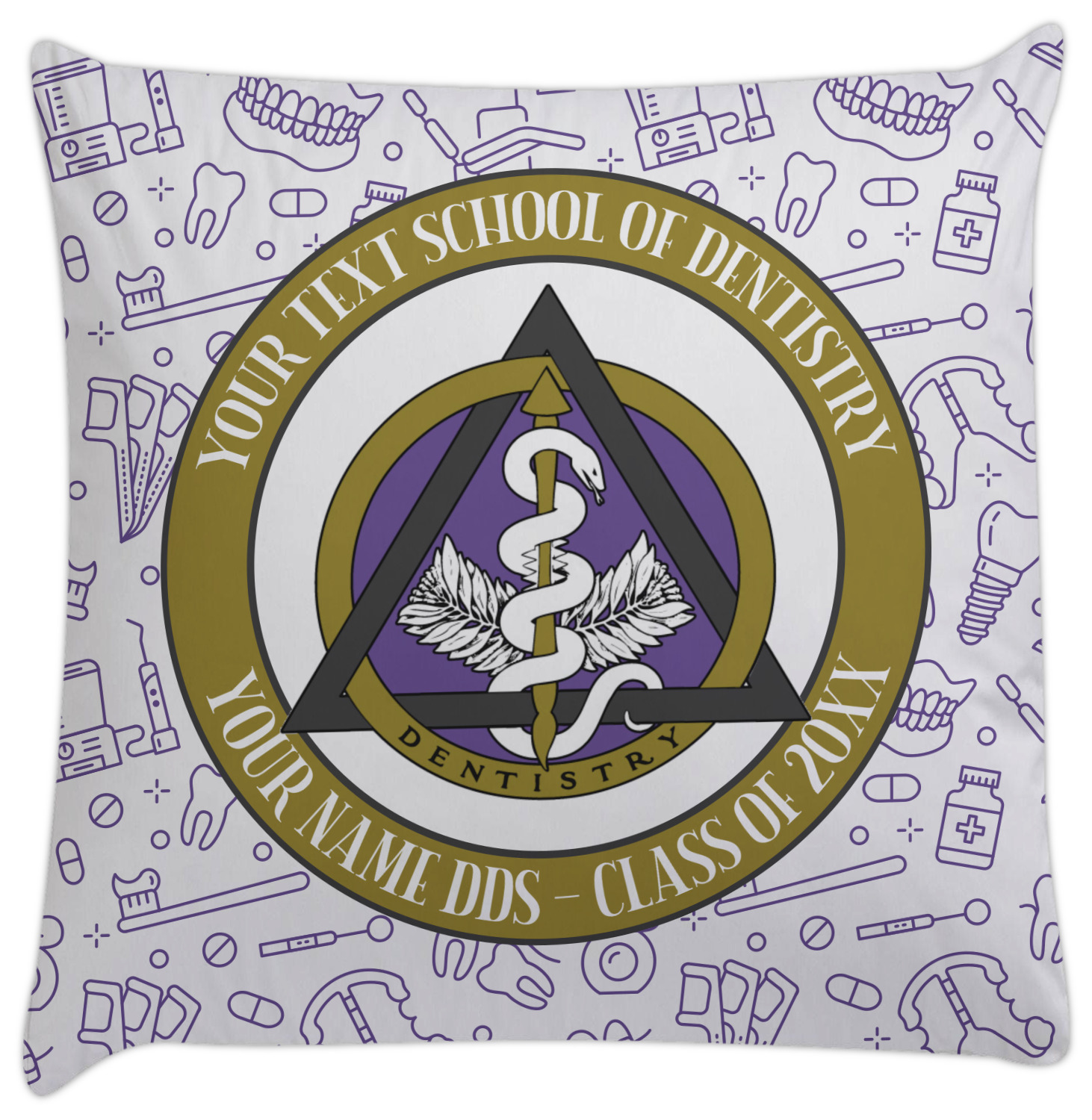 This design features the dental insignia (aka emblem, symbol, logo) at the center with personalization in a circle around the emblem.You can customize the name of the dental school, as well as the name of the dentist and the year they graduated.