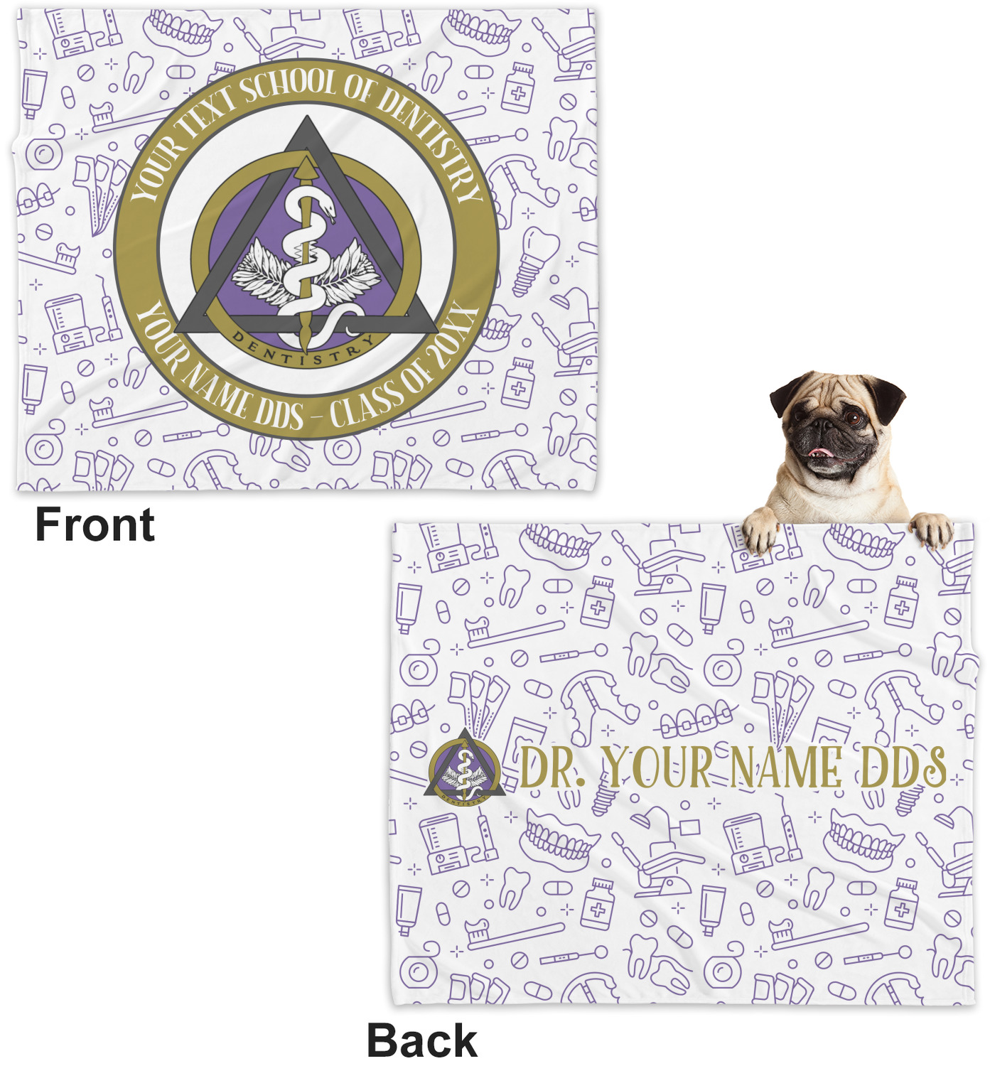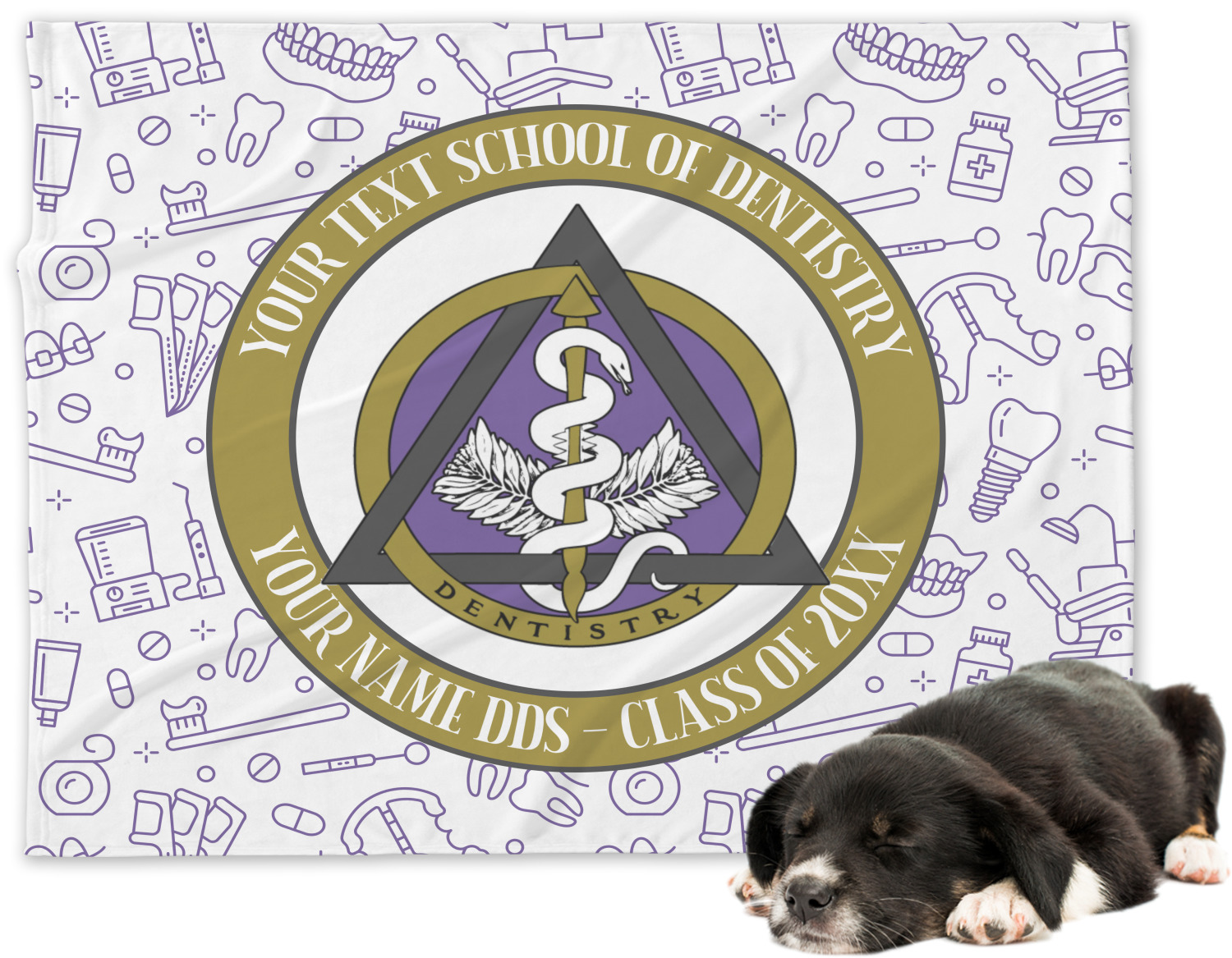 This design features the dental insignia (aka emblem, symbol, logo) at the center with personalization in a circle around the emblem.You can customize the name of the dental school, as well as the name of the dentist and the year they graduated.