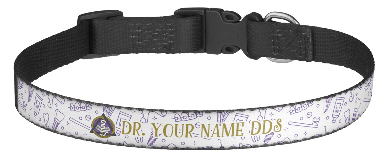 This design features the dental insignia (aka emblem, symbol, logo) at the center with personalization in a circle around the emblem.You can customize the name of the dental school, as well as the name of the dentist and the year they graduated.
