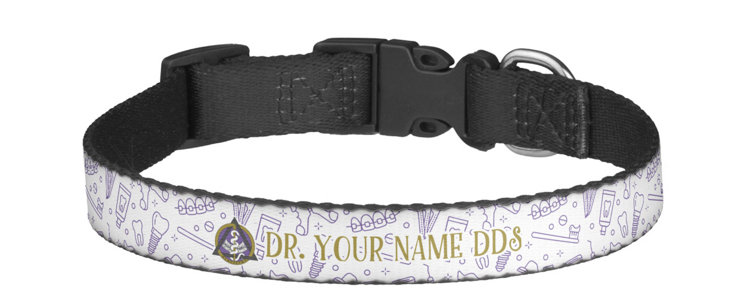 This sturdy collar, made from a durable nylon weave, will outlive your dog's episodes of excited tugging and pulling. Courtesy of its thick plastic buckle and adjuster, this collar is adjustable and accommodating of any dog. Structurally, the collar is a single piece of nylon weave that is sewn together, and features a solid metal loop where you can attach a leash or dog tag. We print and display your dog's name and pattern across the middle of the personalized dog collar.