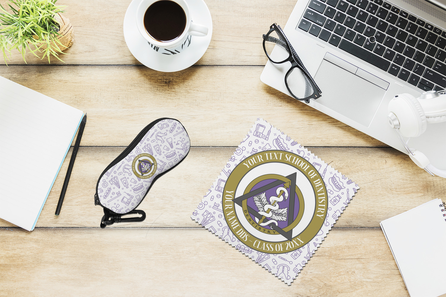 This design features the dental insignia (aka emblem, symbol, logo) at the center with personalization in a circle around the emblem.You can customize the name of the dental school, as well as the name of the dentist and the year they graduated.