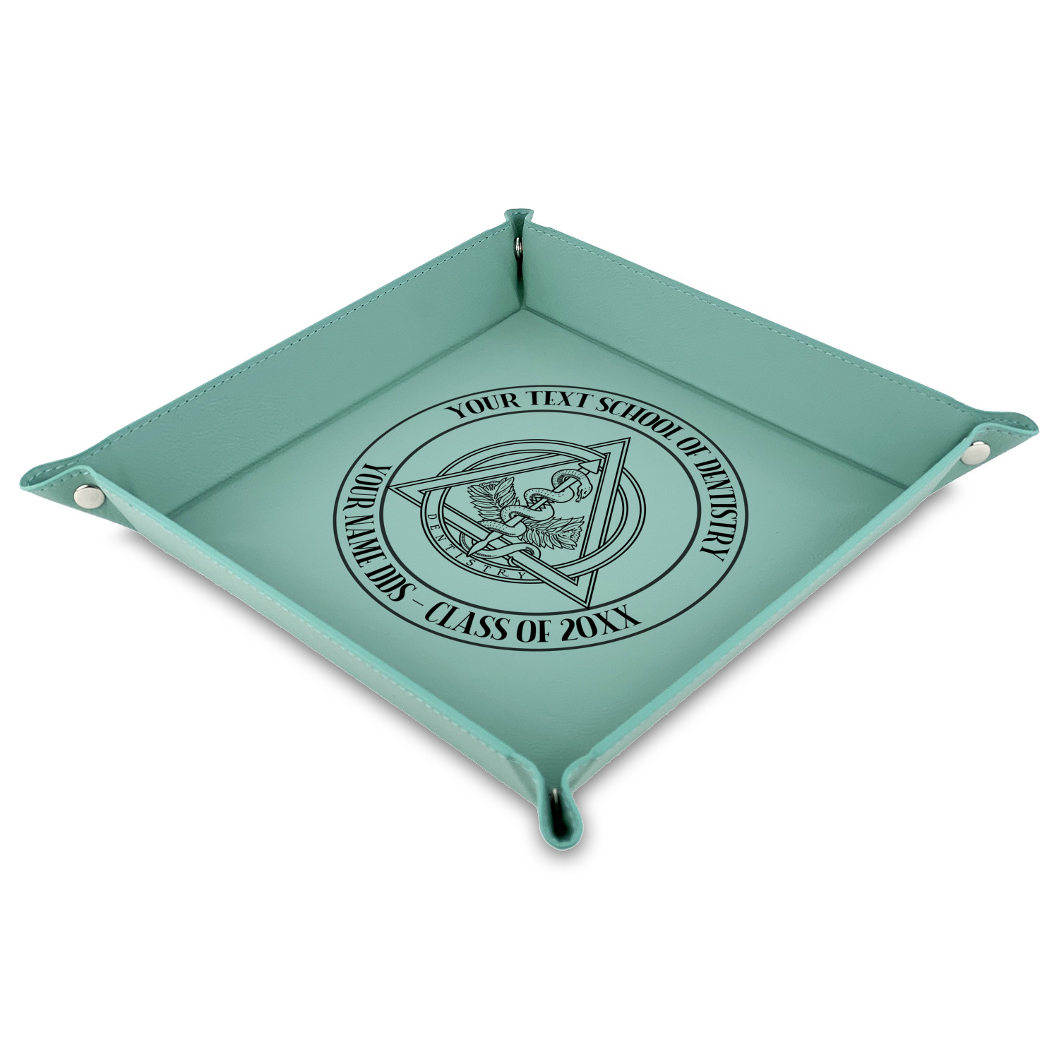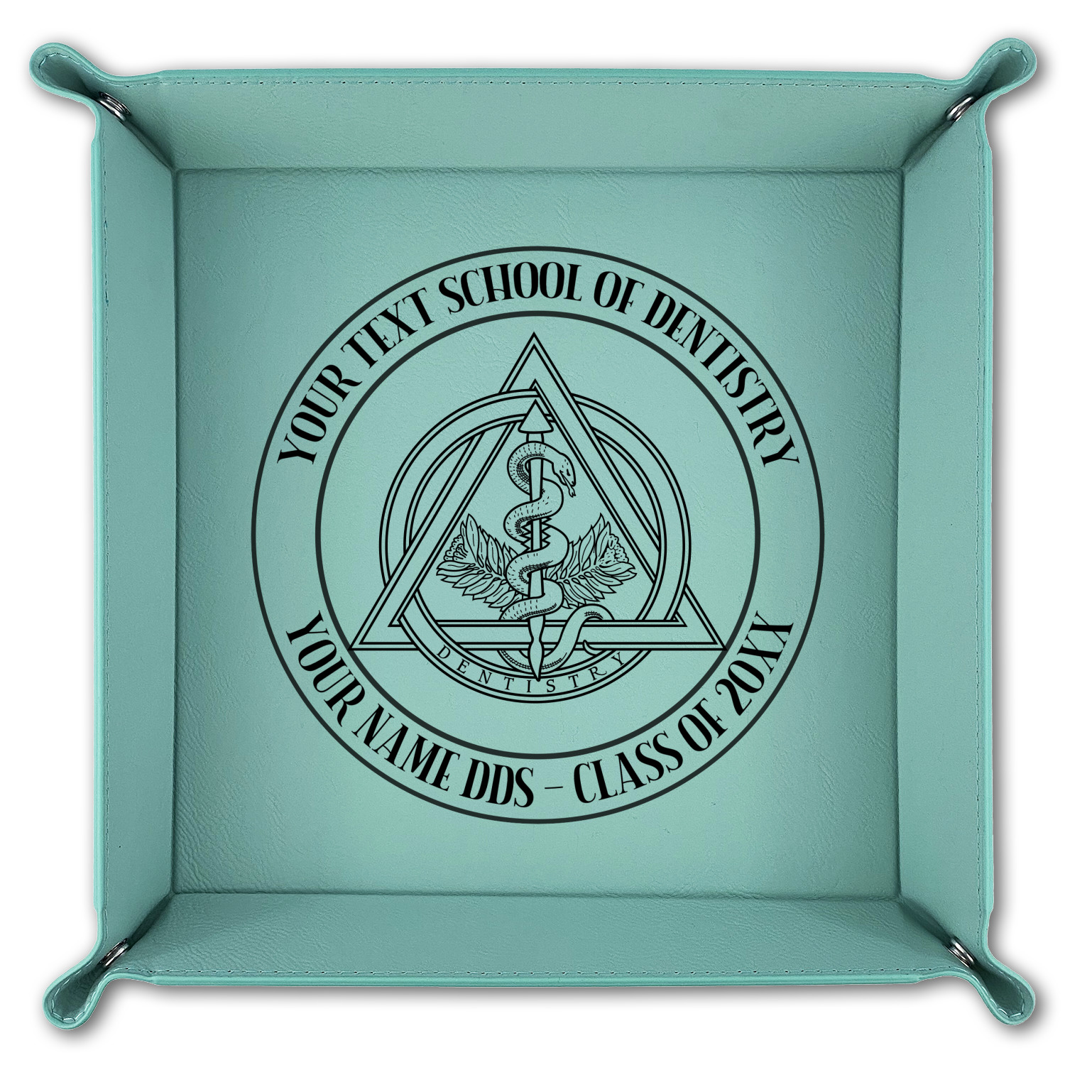 This design features the dental insignia (aka emblem, symbol, logo) at the center with personalization in a circle around the emblem.You can customize the name of the dental school, as well as the name of the dentist and the year they graduated.