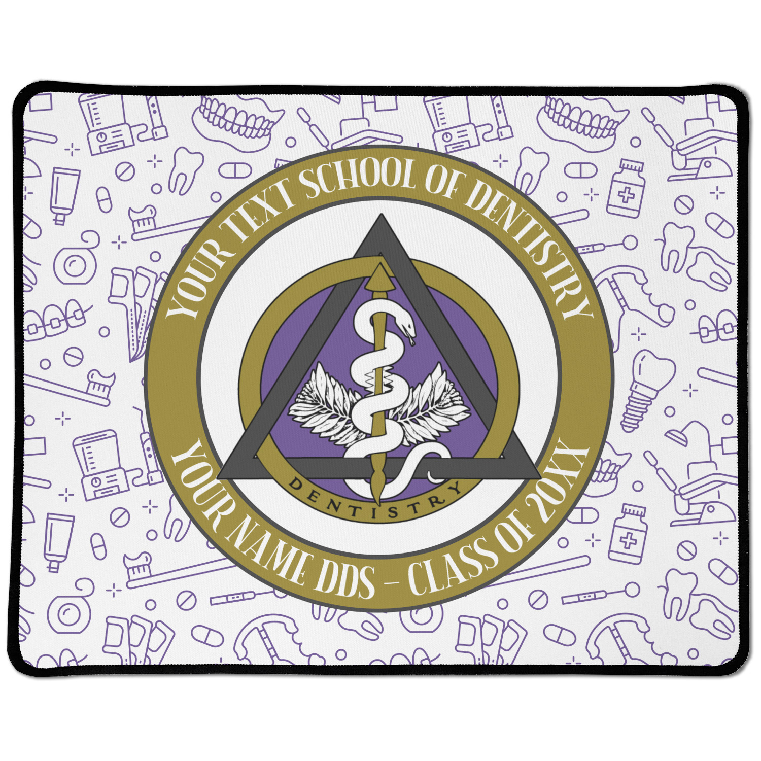 This design features the dental insignia (aka emblem, symbol, logo) at the center with personalization in a circle around the emblem.You can customize the name of the dental school, as well as the name of the dentist and the year they graduated.