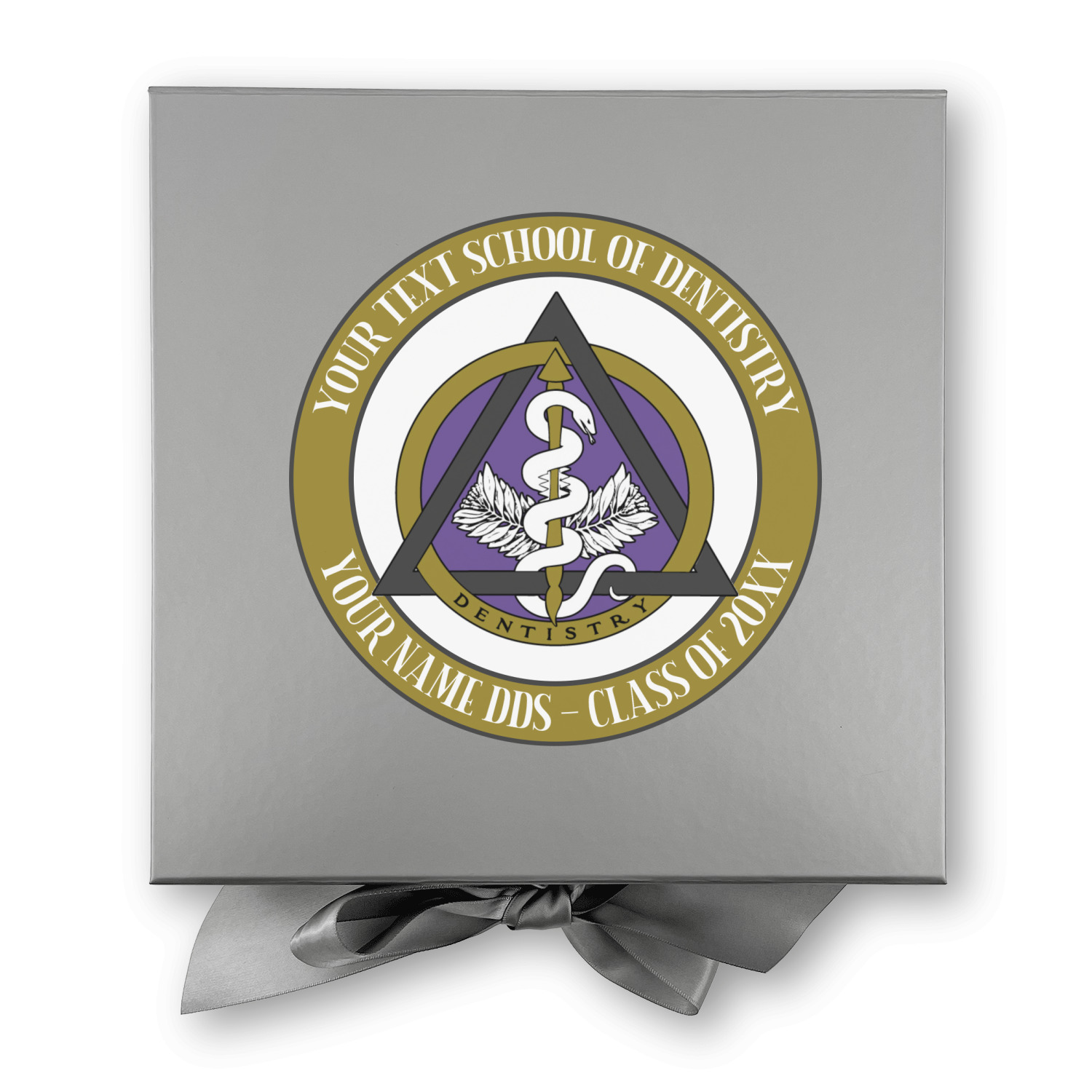 This design features the dental insignia (aka emblem, symbol, logo) at the center with personalization in a circle around the emblem.You can customize the name of the dental school, as well as the name of the dentist and the year they graduated.