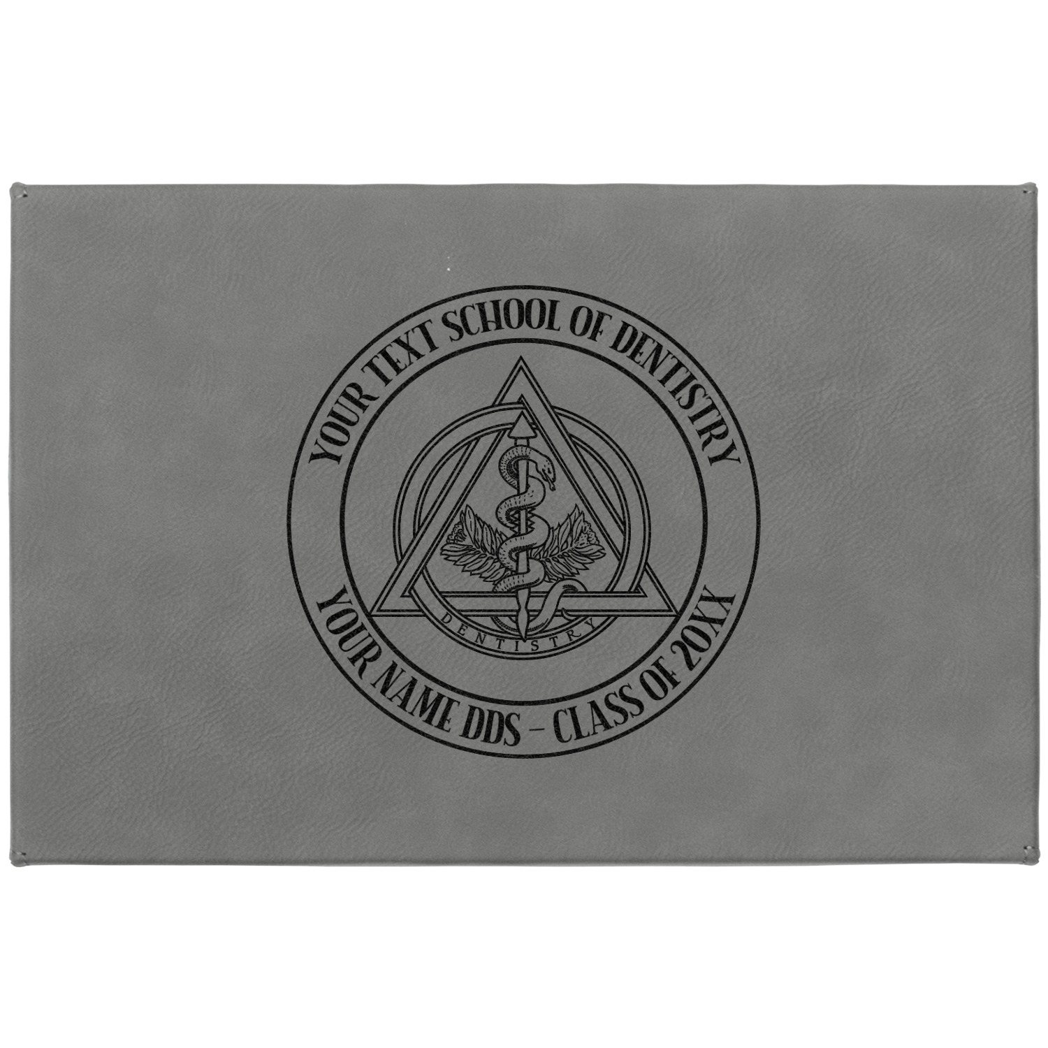 This design features the dental insignia (aka emblem, symbol, logo) at the center with personalization in a circle around the emblem.You can customize the name of the dental school, as well as the name of the dentist and the year they graduated.
