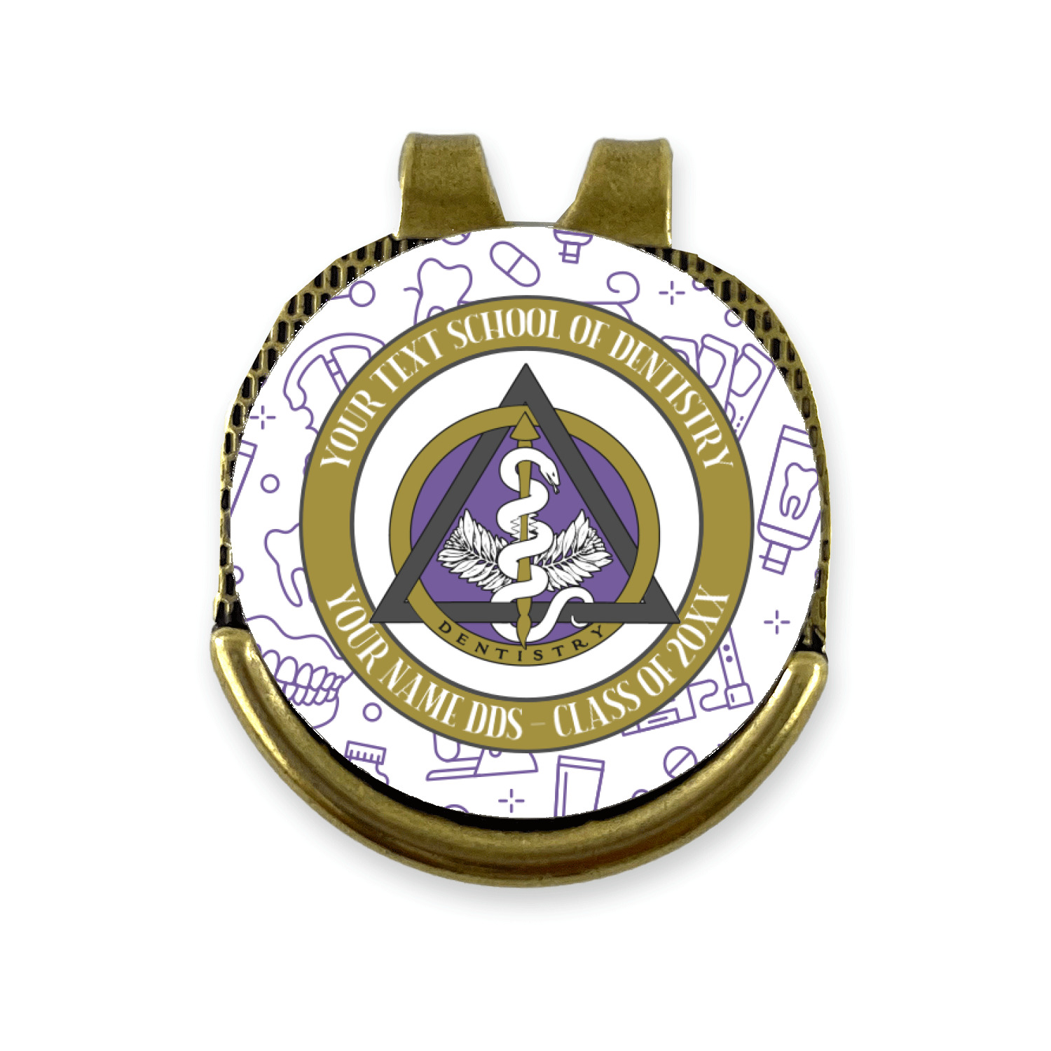 This design features the dental insignia (aka emblem, symbol, logo) at the center with personalization in a circle around the emblem.You can customize the name of the dental school, as well as the name of the dentist and the year they graduated.
