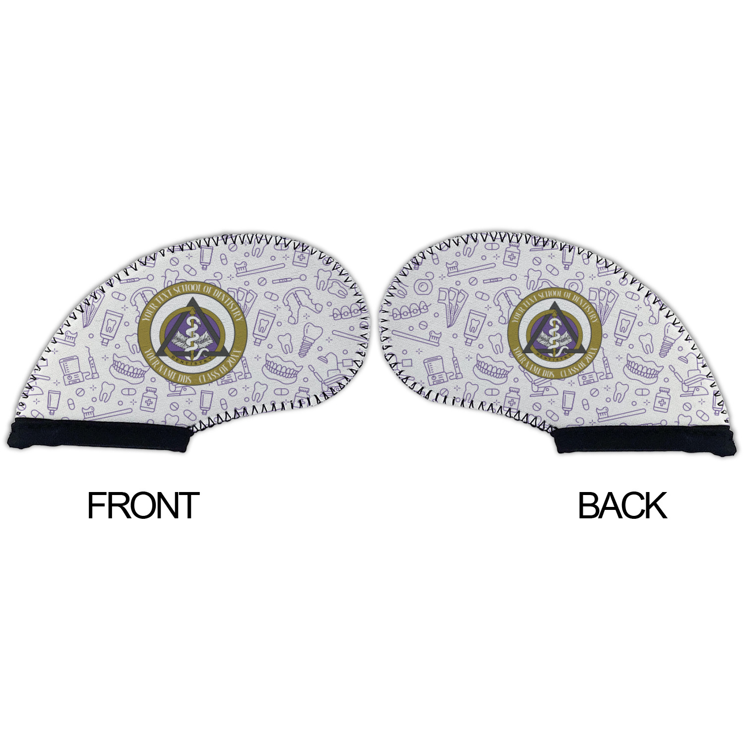 This design features the dental insignia (aka emblem, symbol, logo) at the center with personalization in a circle around the emblem.You can customize the name of the dental school, as well as the name of the dentist and the year they graduated.
