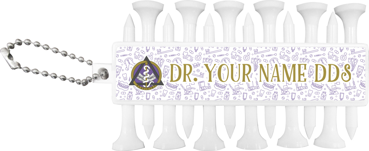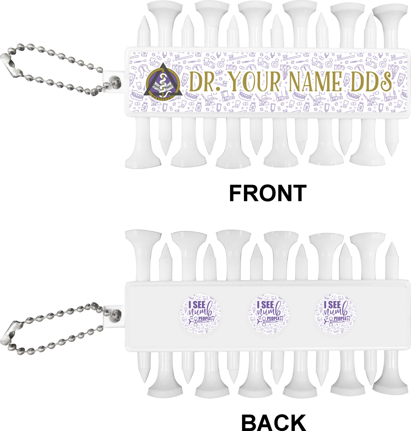 With 12 tees on a lightweight, portable key chain, it almost ensures a great 18 holes. Our tees are made of white plastic and are a little over 2". Design the front and the back of the golf tee holder. Pick from over a hundred designs, colors, and personalization styles! The set even comes with three removable ball markers as well!