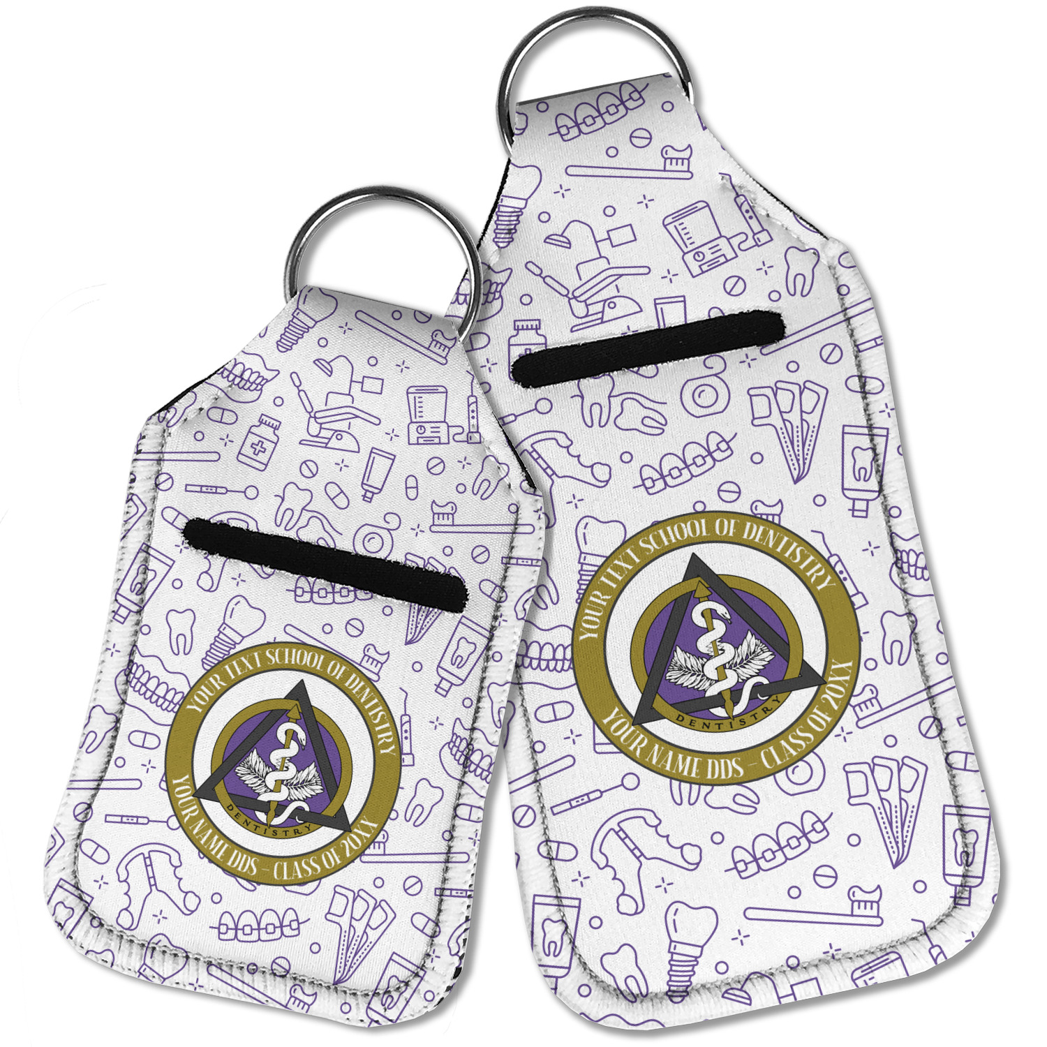 Each hand sanitizer holder comes with its own empty travel-sized, refillable hand sanitizer sure to fit snug in your customized sanitizer case! Our hand sanitizer cases are a durable, yet soft neoprene material sure to last any daily activities or travel agenda. Customize and personalize a hand sanitizer bottle holder with one of our two sizes - small (4.25" x 2.25") or large (5.5" x 2.5"). Each travel sanitizer holder comes with a keyring for attachment on bags, keys, or more!