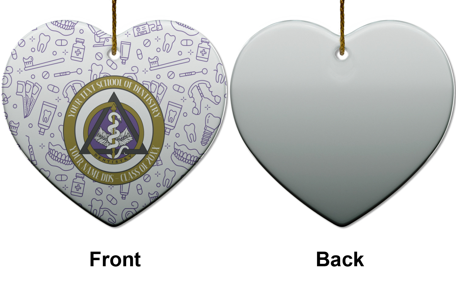 This design features the dental insignia (aka emblem, symbol, logo) at the center with personalization in a circle around the emblem.You can customize the name of the dental school, as well as the name of the dentist and the year they graduated.