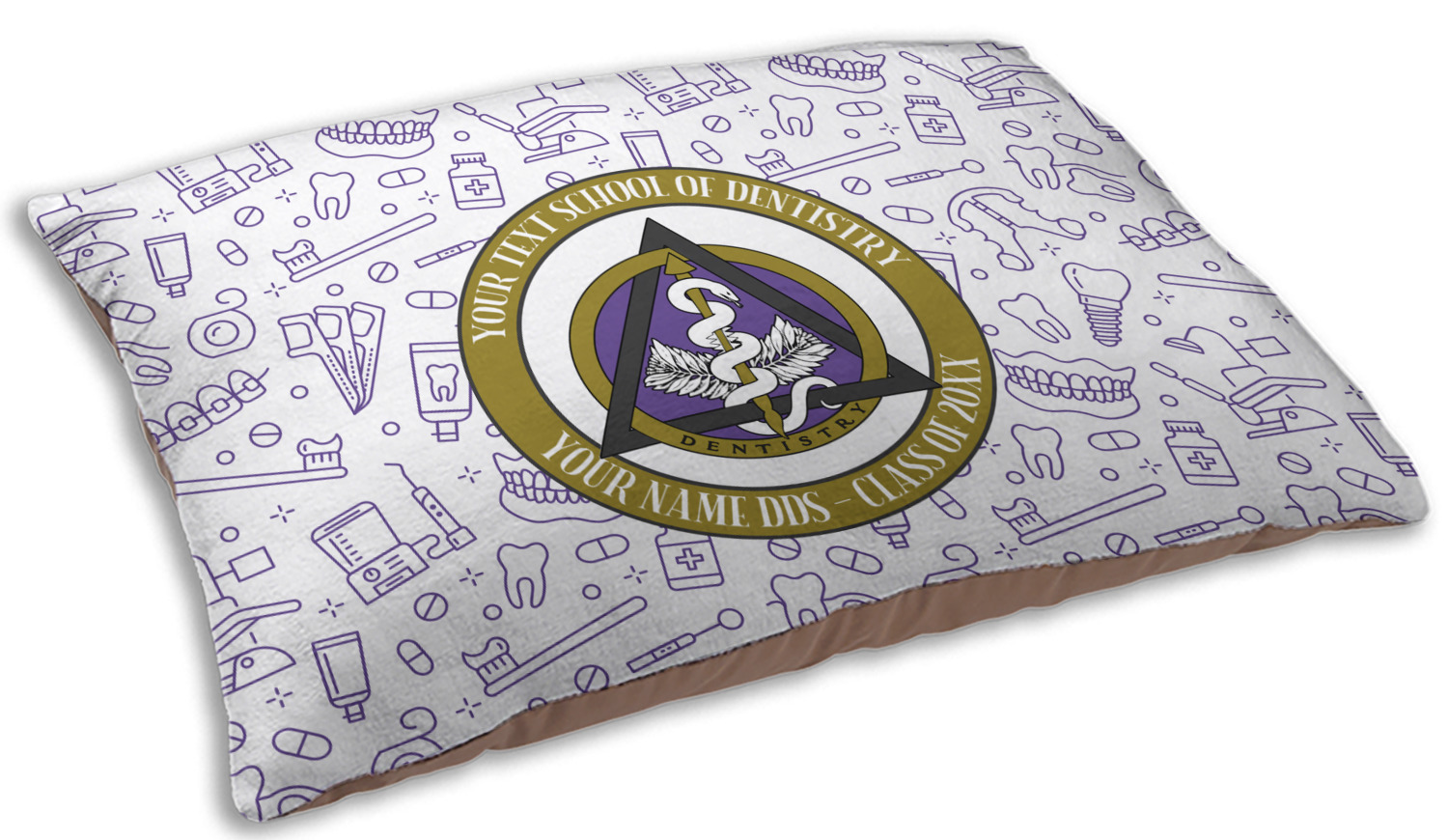This design features the dental insignia (aka emblem, symbol, logo) at the center with personalization in a circle around the emblem.You can customize the name of the dental school, as well as the name of the dentist and the year they graduated.