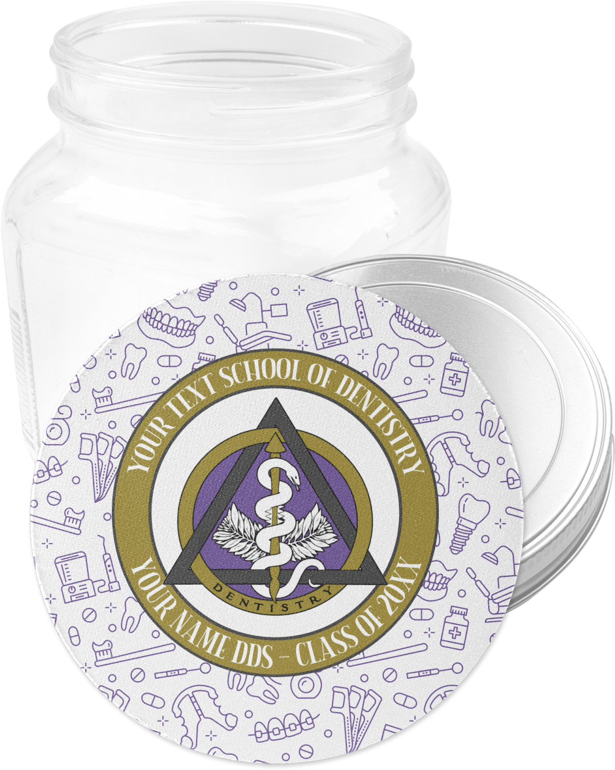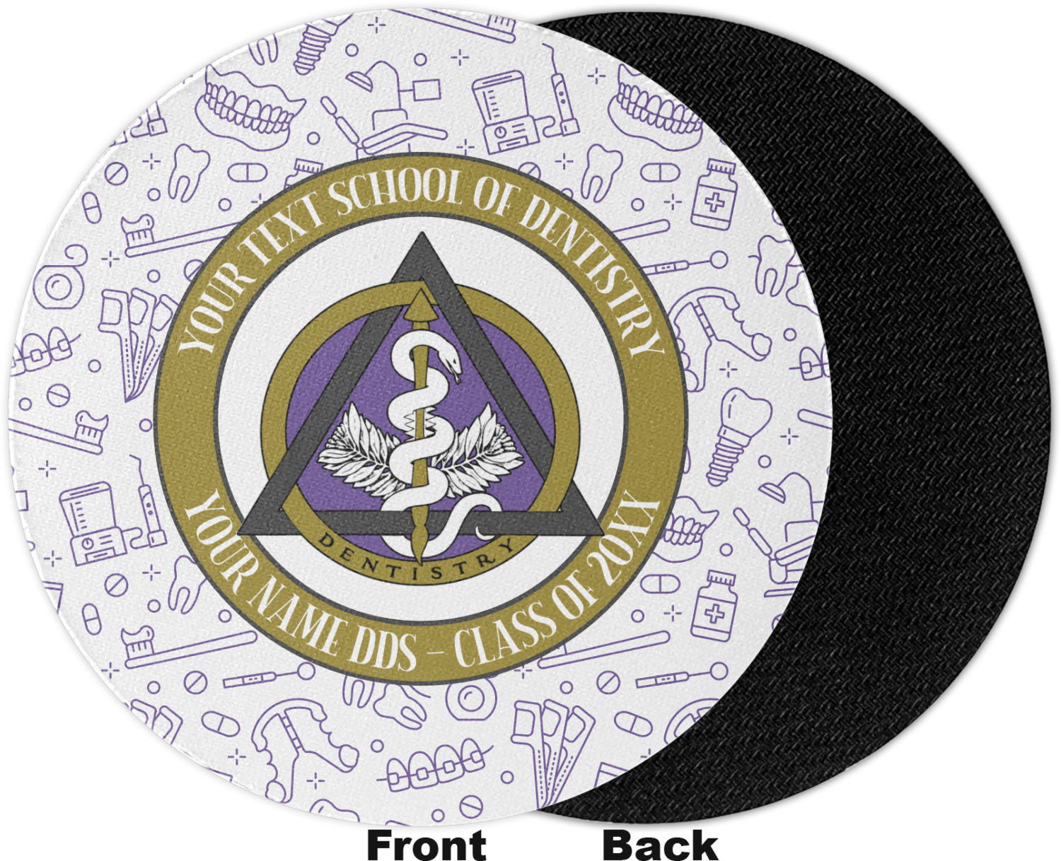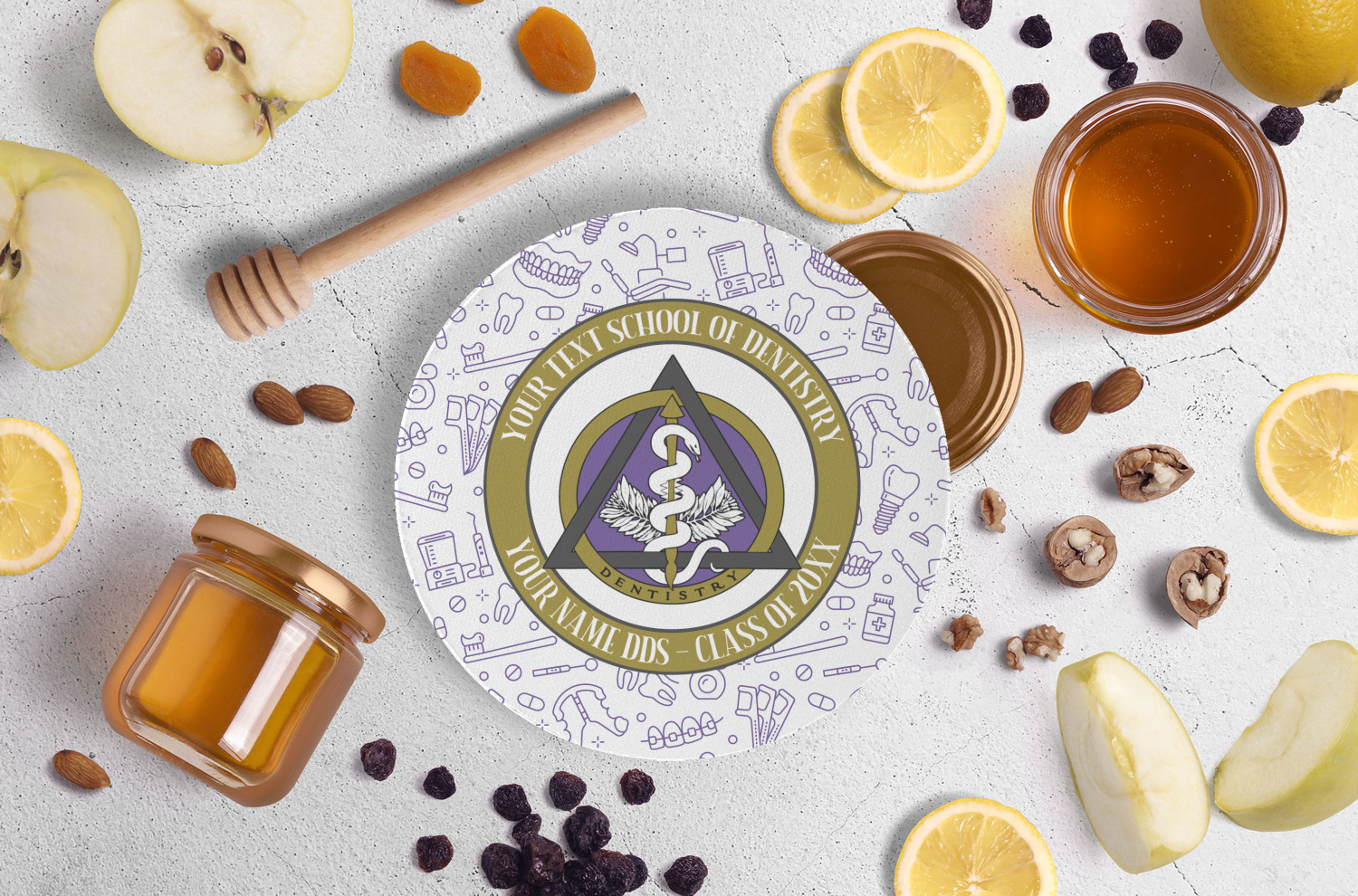 This design features the dental insignia (aka emblem, symbol, logo) at the center with personalization in a circle around the emblem.You can customize the name of the dental school, as well as the name of the dentist and the year they graduated.
