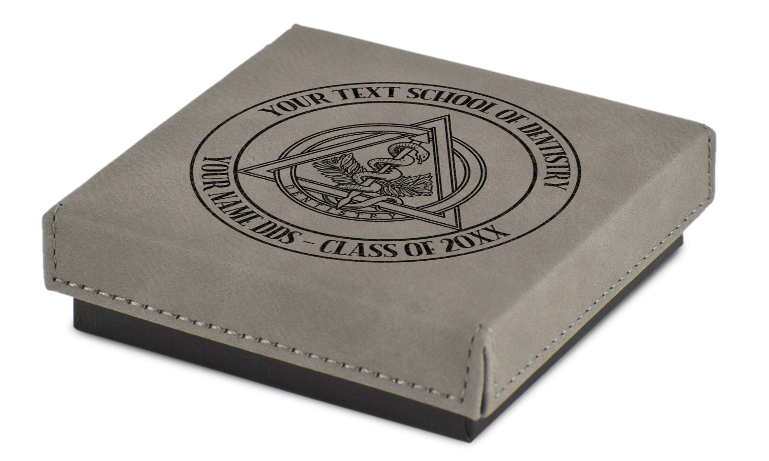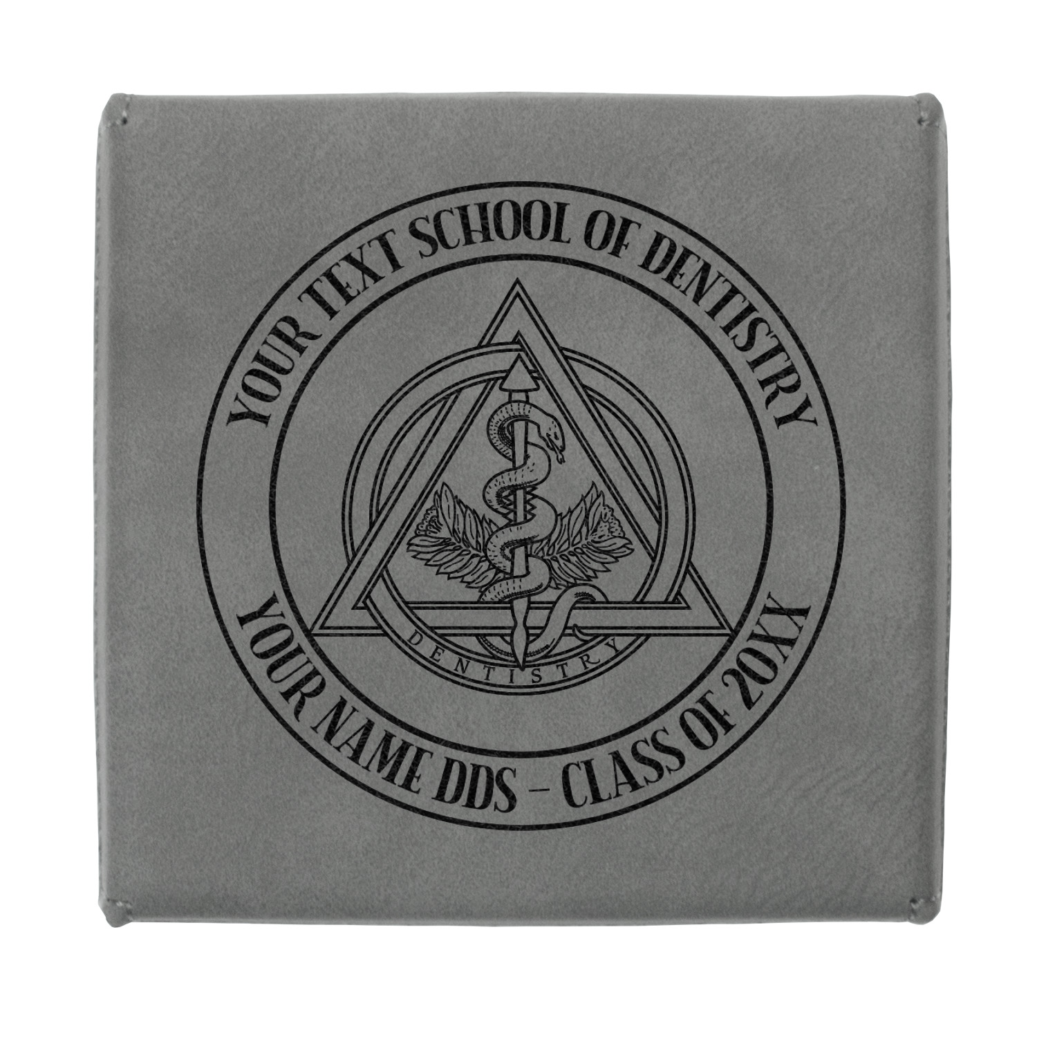 This design features the dental insignia (aka emblem, symbol, logo) at the center with personalization in a circle around the emblem.You can customize the name of the dental school, as well as the name of the dentist and the year they graduated.