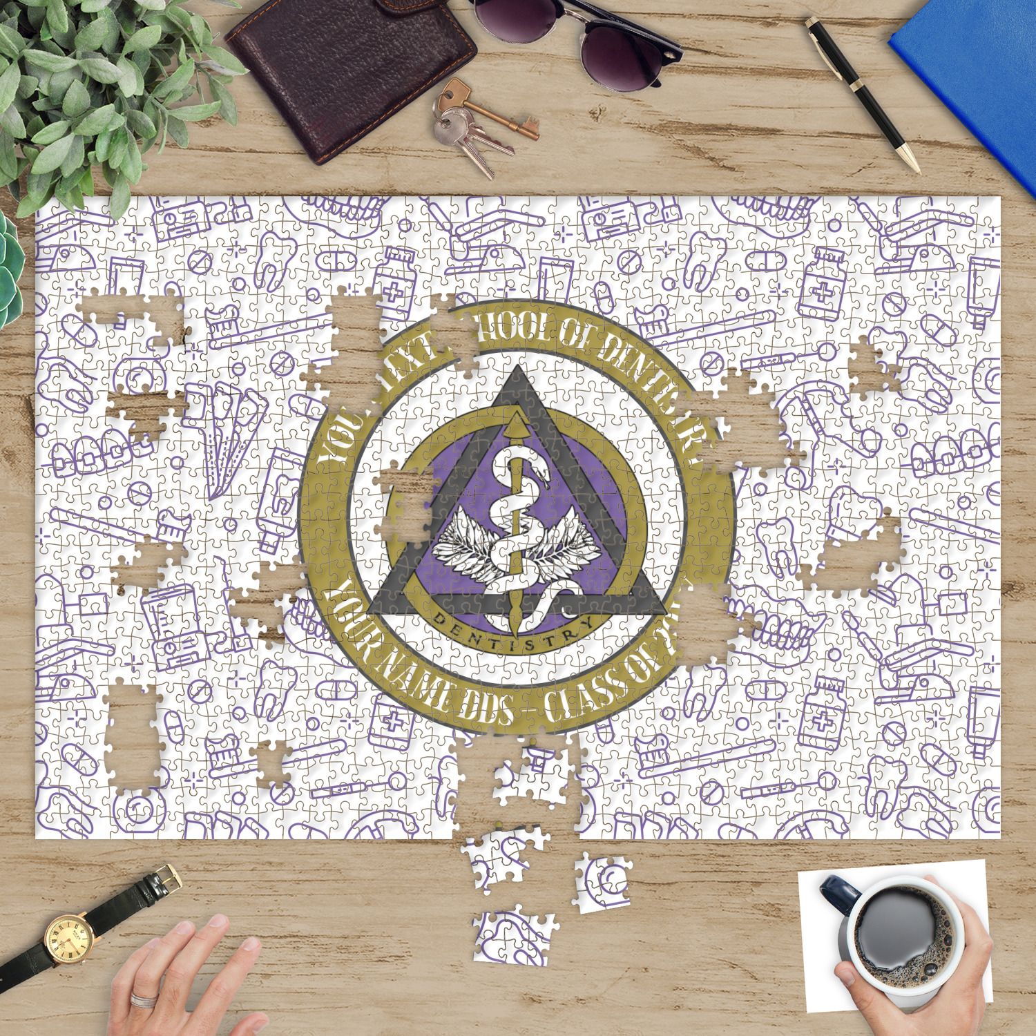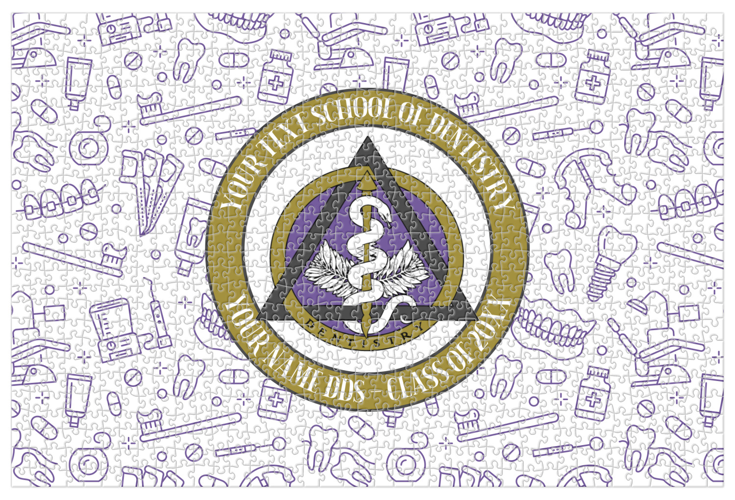 This design features the dental insignia (aka emblem, symbol, logo) at the center with personalization in a circle around the emblem.You can customize the name of the dental school, as well as the name of the dentist and the year they graduated.