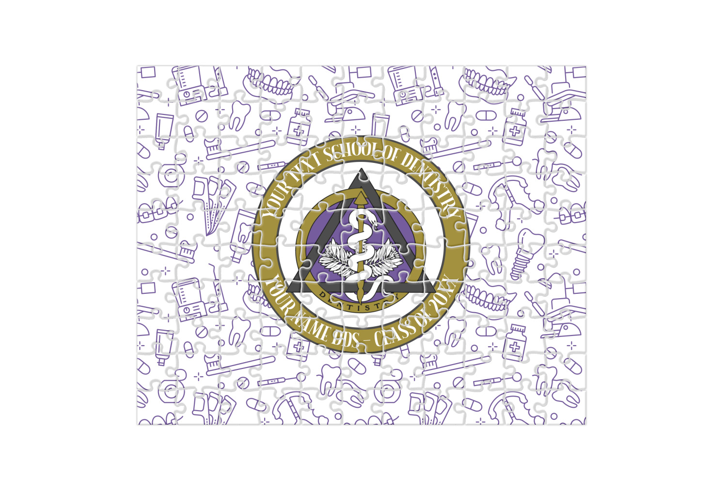 This design features the dental insignia (aka emblem, symbol, logo) at the center with personalization in a circle around the emblem.You can customize the name of the dental school, as well as the name of the dentist and the year they graduated.